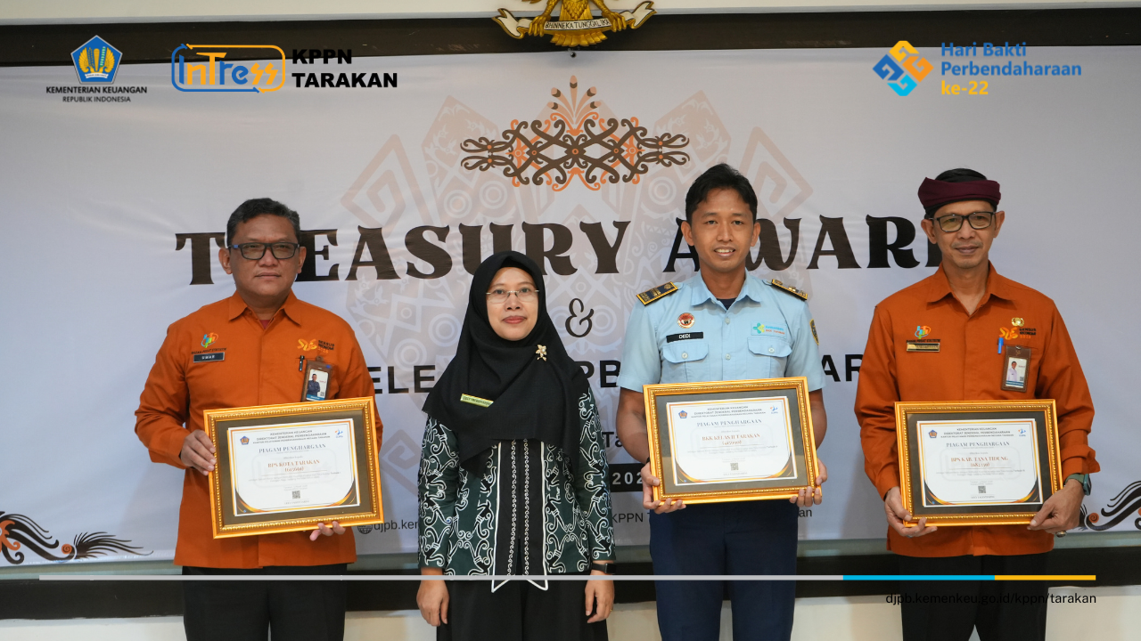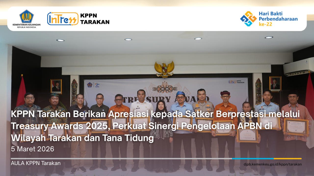 Kantor Pelayanan Perbendaharaan Negara (KPPN) Tarakan menyelenggarakan kegiatan Treasury Awards 2025 sebagai bentuk apresiasi kepada satuan kerja mitra atas kinerja terbaik dalam pelaksanaan anggaran Tahun Anggaran 2025. Kegiatan ini merupakan agenda tahunan yang diselenggarakan oleh KPPN Tarakan untuk memberikan penghargaan kepada satuan kerja yang menunjukkan kinerja unggul dalam pengelolaan keuangan negara serta mendorong peningkatan kualitas tata kelola pelaksanaan Anggaran Pendapatan dan Belanja Negara (APBN).