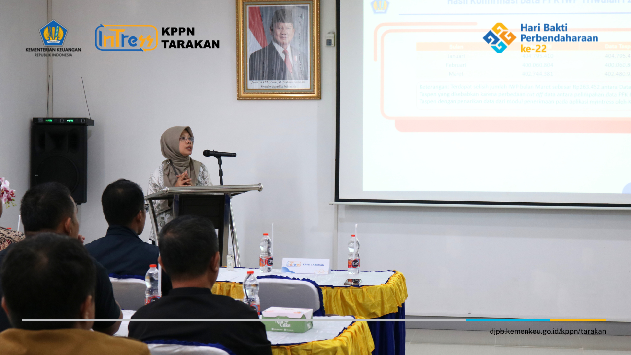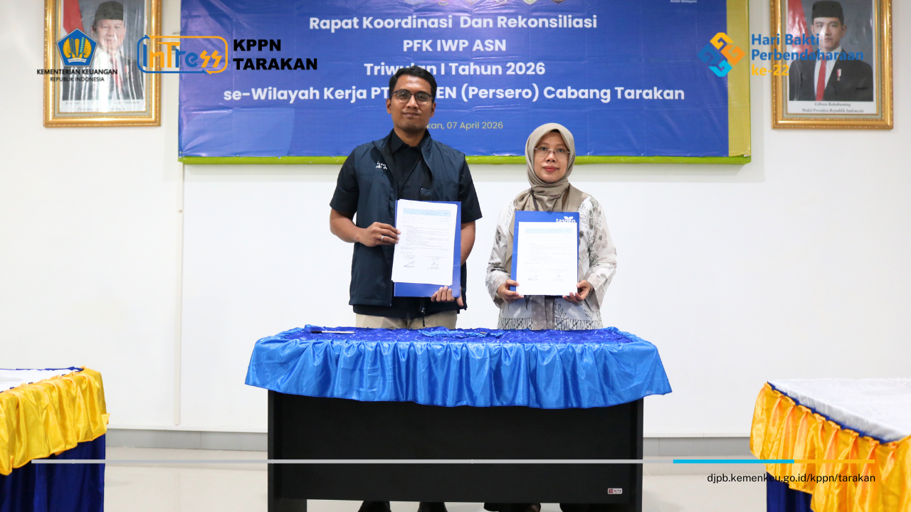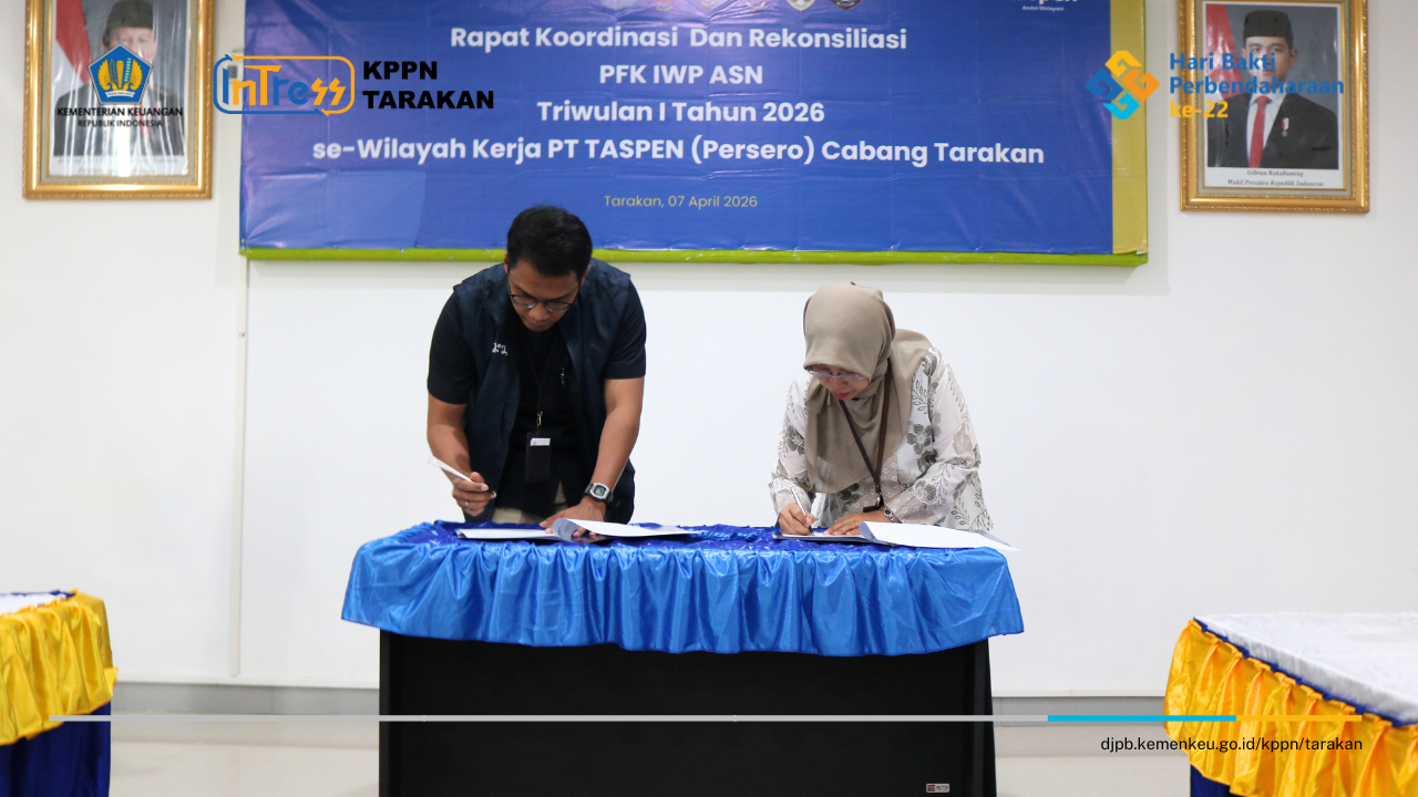 Selasa, 7 April 2026 Kepala KPPN Tarakan, Ibu Lely Yalestiarini telah memenuhi undangan Taspen Cabang Kota Tarakan dalam rangka melaksanakan Rekonsiliasi Data Gaji dan IWP Bagi Pejabat Negara, Pegawai Aparatur Sipil Negara dan Pegawai PPPK Periode Triwulan I Tahun 2026 untuk Pemda Kota Tarakan dan Pemda Kabupaten Tana Tidung. Pada kesempatan kali ini, Ibu Lely Yalestiarini menyampaikan bahwa Rekonsiliasi luran Wajib Pegawai bertujuan untuk mencocokkan data PFK antara Taspen, KPPN, dengan Pemda agar mewujudkan data iuran penerimaan negara yang akurat.