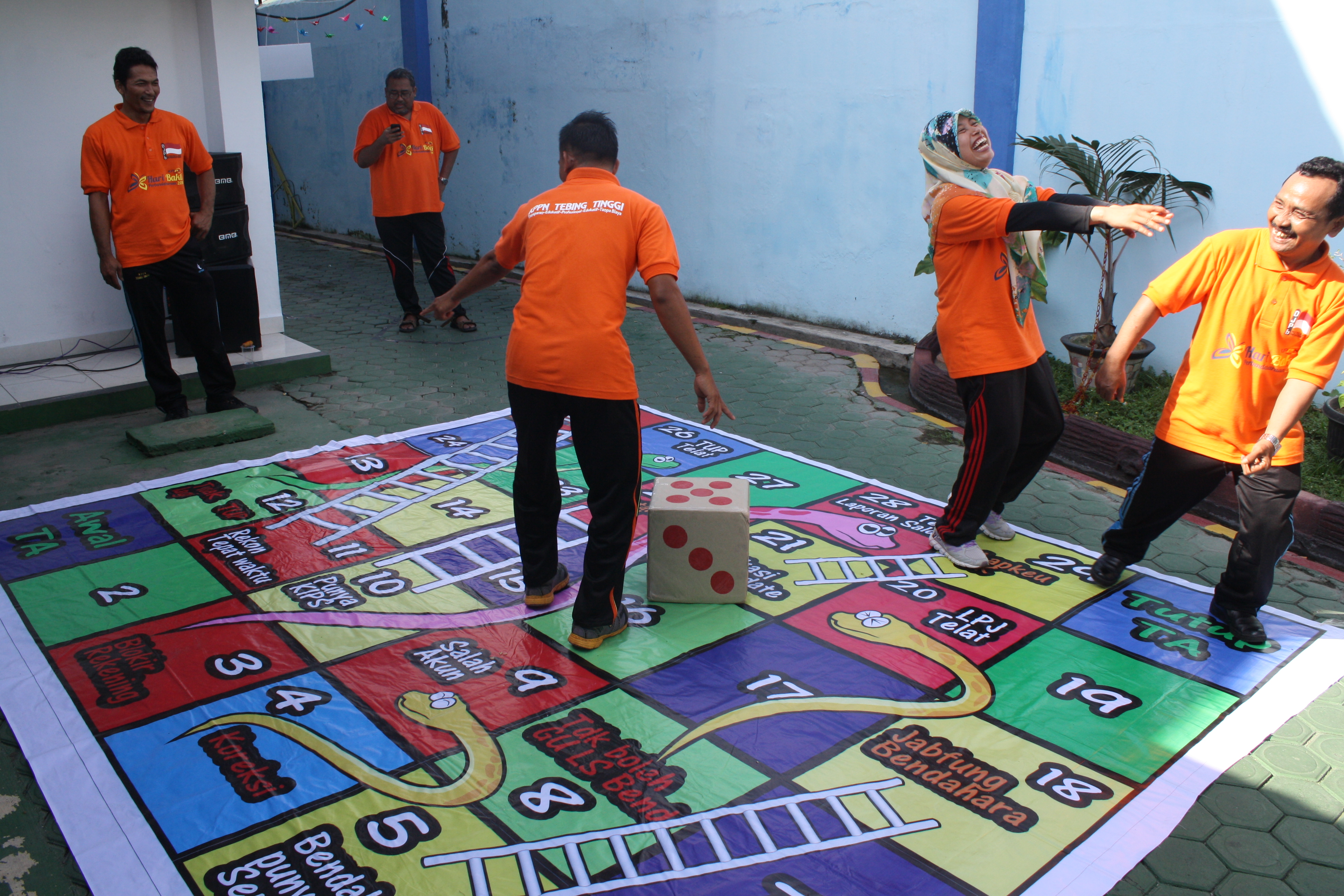 Selain itu, masih ada permainan yang tak kalah serunya, yaitu bermain Ular Tangga raksasa ala KPPN Tebing Tinggi. Berbeda dengan permainan ular tangga biasanya, ular tangga ala KPPN Tebing Tinggi berukuran raksasa dengan peserta langsung berperan sebagai “pionnya”, dan tema pada setiap kotaknya berkaitan dengan perbendaharaan. Misalnya : bagi peserta yang tepat berada di kotak yang berisi “ rekon tepat waktu” maka akan dapat bonus langsung naik tangga melewati beberapa nomor sekaligus. Begitu juga sebaliknya, jika peserta tiba pada kotak yang berisikan ketidakpatuhan, seperti terlambat menyampaikan LPJ atau data kontrak, maka peserta diberi hukuman turun kembali beberapa nomor ke belakang. Gelak tawa memenuhi suasana permainan karena para peserta sering turun karena mendapat angka tepat di posisi ular dan harus kembali ke kotak Start ketika ada peserta lain yang masuk ke kotaknya.