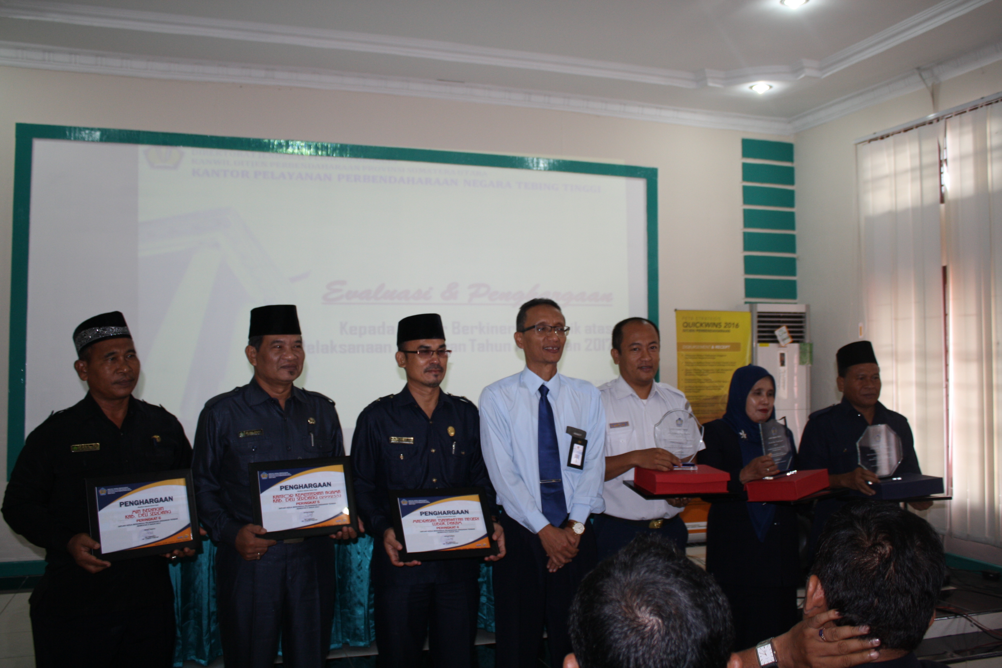 Mengawali tahun anggaran 2018, KPPN Tebing Tinggi menggelar acara bertajuk “Evaluasi Pelaksanaan Anggaran dan Pemberian Penghargaan Kepada Satker Berkinerja Terbaik Periode Semester II 2017. Acara dilaksanakan pada Hari Rabu, tanggal 24 Januari 2018, di Aula KPPN Tebing Tinggi dan dihadiri para Kuasa Pengguna Anggaran mitra kerja KPPN Tebing Tinggi. “Acara pada hari ini digelar sebagai upaya KPPN Tebing Tinggi untuk melakukan evaluasi terhadap pelaksanaan anggaran pada satuan kerja, sekaligus memberikan penghargaan dan apresiasi terhadap satker yang berkinerja terbaik selama periode semester II 2017”, kata Kepala KPPN Tebing Tinggi, Edy Purwanto mengawali sambutannya. Secara umum, pelaksanaan anggaran pada satuan kerja mitra kerja KPPN Tebing Tinggi pada tahun 2017, relatif lebih baik dari tahun 2016. Indikatornya diantaranya adalah :