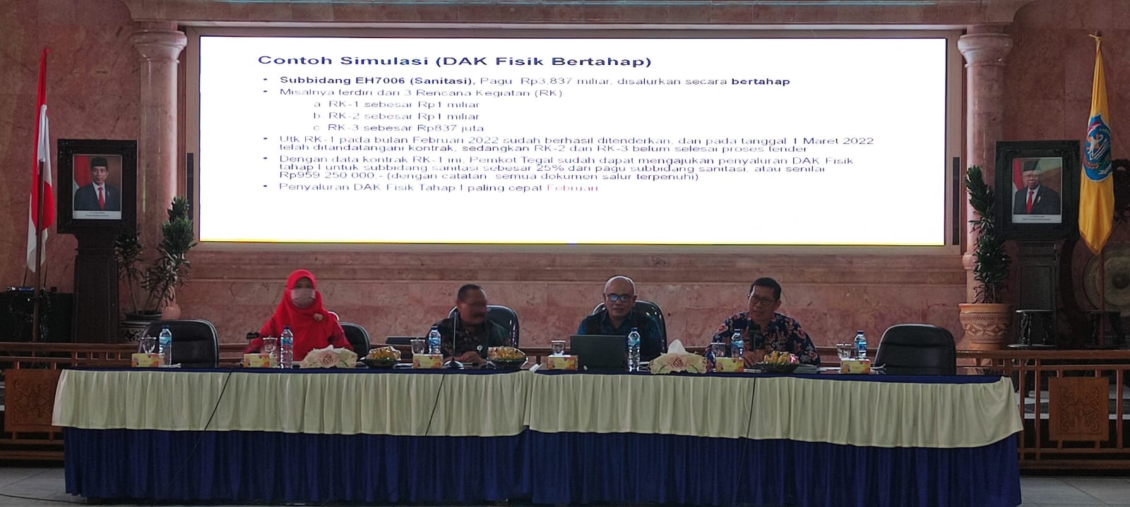 Dalam rangka percepatan penyaluran Dana Alokasi Khusus (DAK) Fisik kabupaten/kota Tahun Anggaran 2022 lingkup Provinsi Jawa Tengah, Kanwil Ditjen Perbendaharaan Provinsi Jawa Tengah adakan rapat koordinasi percepatan penyaluran DAK Fisik TA 2022 bersama Pemerintah Kota Tegal pada Selasa (22/03). Kegiatan yang diselenggarakan di aula Pemerintah Kota Tegal tersebut menghadirkan narasumber utama Kepala Kanwil Ditjen Perbendaharaan Provinsi Jawa Tengah Bpk. Midden Sihombing dan Kepala KPPN Tegal Bpk. Sunoto.