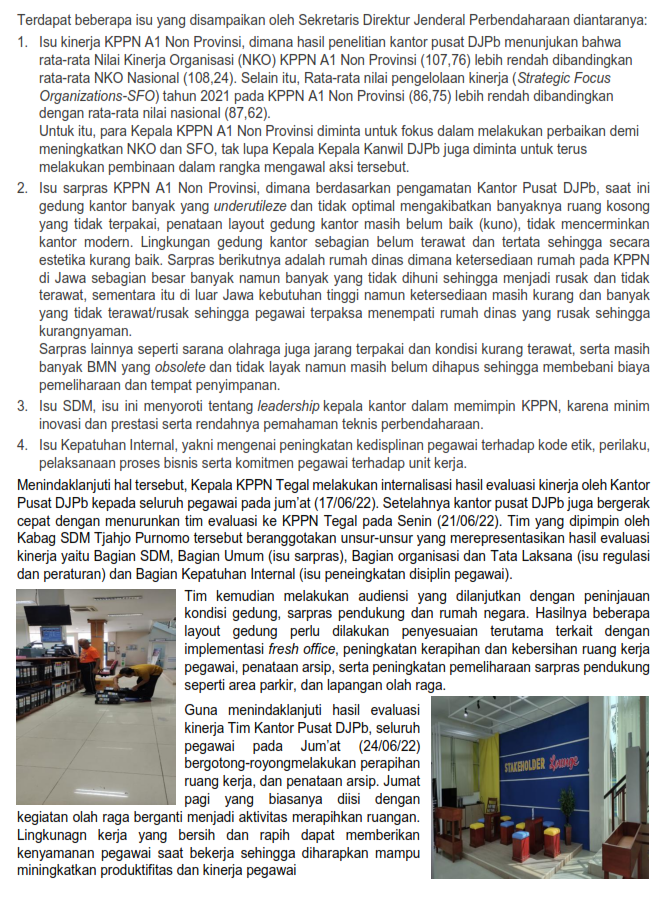 Sekretaris Direktur Jenderal Perbendaharaan Didyk Choiroel pada Rabu (15/06/22) menyampaikan paparan mengenai evaluasi, strategi dan rencana aksi penguatan tugas dan fungsi KPPN A1 Non Provinsi. Kegiatan yang dilakukan secara daring tersebut diikuti oleh para Kepala Kanwi DJPb, Kepala KPPN A1 Non Provinsi beserta Kepala Subbagian Umum seluruh Indonesia.