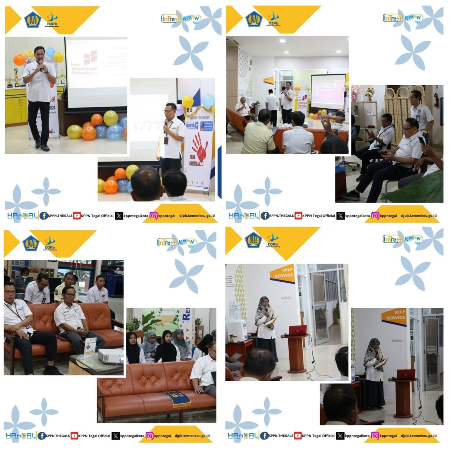 Tegal, 26 November 2024, dalam rangka rangka menyeramakan Harii Anti Korupsi Sedunia 2024, KPPN tegal melaksanakan acara Town hall meeting internalisasi membangun budaya antikorupsi, penanganan benturan kepentingan, dan titik rawan gratifikasi. Kegitan ini bertempat di lantai satu di runag front office dan oleh pemandu acara, Ibu Khusnul Khotimah, dilanjutkan sambutan oleh Kepala Seksi MSKI, Bapak Suranto. Dalam sambutannya Bapak Suranto menyampaikan beberapa hal terkait rangkaian kegiatan dalam rangka Hakordia Tahun 2024 pada KPPN Tegal, diantaranya adalah sosialiasi melalui media sosial, pembagian PIN Hakordia Tahun 2024 dan edukasi terkait antikorupsi bagi masyarakat, dan kegiatan town hall meeting. selajutnya Beliau menyampaikan terima kasih kepada pimpinan atas profilnya sebagai roll model yang ditunjukkan diantaranya tidak menggunakan/membawa kendaraan dinas untuk dibawa pulang ke rumah. Beliau juga menekankan agar seluruh pejabat/pegaewai KPPN Tegal untuk senantiasa menjaga integritas. Sebagaimana pula disampaikan kepada satker dalam berbagai kesempatan, agar benar-benar menghindari fraud. Kesalahan yang bersifat administratif masih bisa diperbaiki, akan tetapi kesalahan yang bersifat fraud harus benar-benar dihindari.