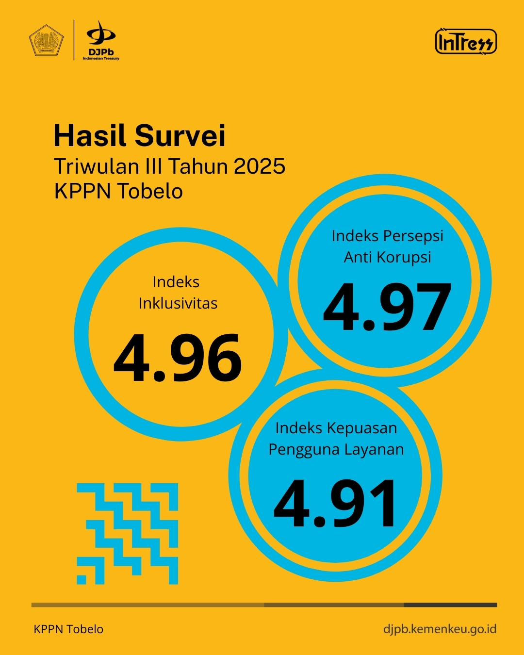 Secara keseluruhan, hasil survei menunjukkan tingkat kepuasan pelanggan yang sangat tinggi terhadap layanan yang diberikan oleh KPPN Tobelo. Seluruh unsur memperoleh nilai di atas 3,85, dengan dua unsur memperoleh nilai sempurna. Hal ini menunjukkan bahwa KPPN Tobelo telah mampu memberikan pelayanan yang prima.