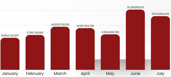 Realisasi Transfer ke Daerah bulan Juli tahun 2025 mencapai Rp1,37 T atau 49% dari target pagu Rp2.43 T. Terdiri dari Dana Bagi hasil disalurkan 55% sebesar Rp309,02 miliar, Dana Alokasi Umum disalurkan 62% sebesar Rp680,12 miliar, Dana Transfer Khusus yang terdiri DAK Fisik realisasinya sebesar Rp0 miliar dari target pagu Rp69,47 miliar. DAK Non Fisik realisasinya sebesar Rp207,96 miliar atau 51% dari pagu Rp408,08 miliar. Dana Desa realisasinya sebesar Rp173,44 miliar atau 56% dari pagu 307,05 miliar.