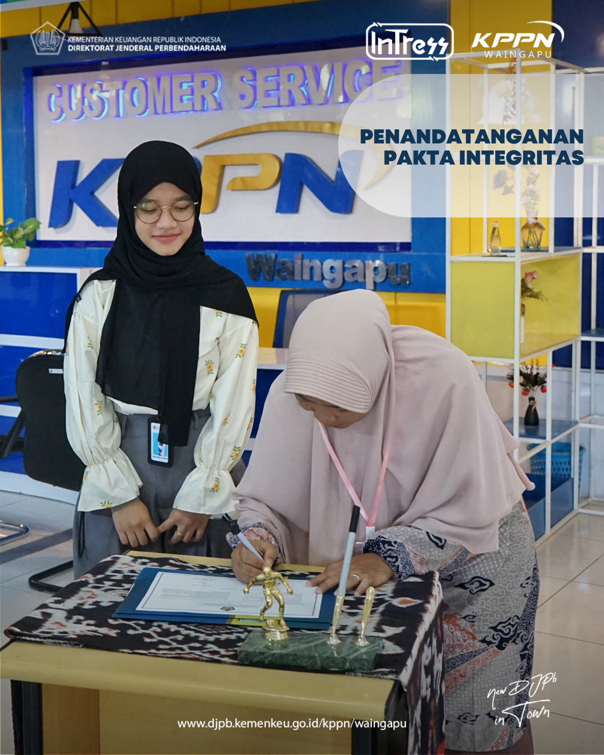 Oleh karena itu, berdasarkan Pasal 11 ayat (1) huruf b dan c Peraturan Direktur Jenderal Perbendaharaan Nomor PER-20/PB/2023 tentang Tata Kelola Pelaksanaan Tugas Kepatuhan Internal di Lingkungan Direktorat Jenderal Perbendaharaan, penandatanganan Pakta Integritas seluruh pegawai di lingkungan Direktorat Jenderal Perbendaharaan diperbarui pada setiap awal tahun dan dalam hal terjadi perubahan jabatan/unit kerja pegawai yang bersangkutan, KPPN Waingapu melaksanakan kegiatan Penandatanganan Pakta Integritas pada ruang front office KPPN Waingapu (28/11).