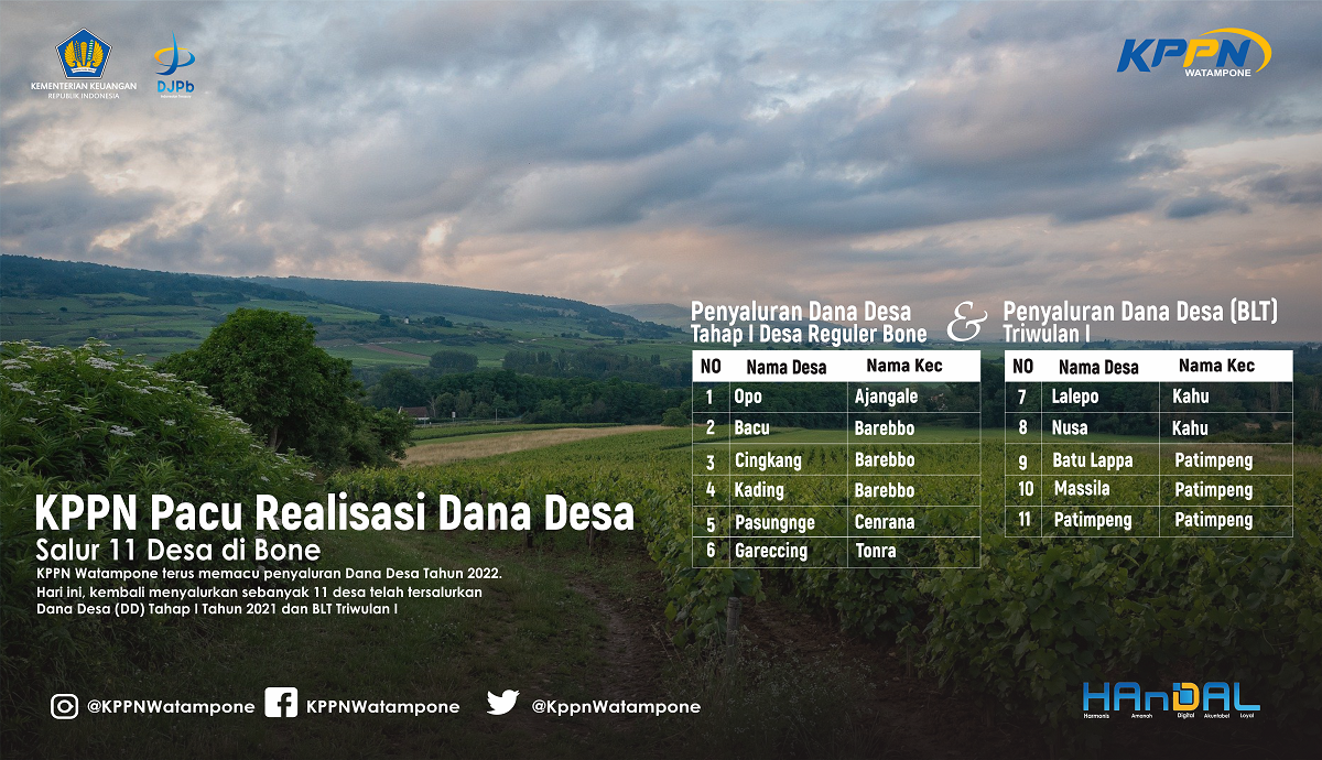 Berdasarkan data Online Monitoring Sistem Perbendaharaan dan Anggaran Negara (OM SPAN) telah tersalurkan DD Tahap I tahun 2022 oleh KPPN Watampone sebesar Rp2,36 miliar untuk 11 desa dan BLT Desa Triwulan I tahun 2022 sebesar Rp1,02 miliar untuk 11 desa.