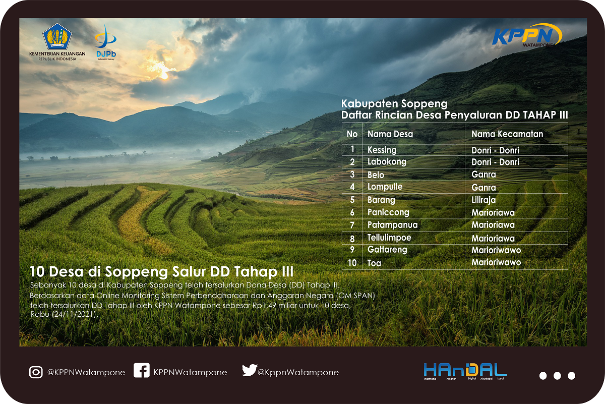 KPPN Watampone terus memacu penyaluran dana Transfer Keuangan dan Dana Desa (TKDD). Sampai dengan saat ini, Jum’at (26/11/2021), baru 2 Subbidang DAK Fisik yang telah terealisasi DAK Fisik Tahap III 2021. Yaitu DAK Fisik Reguler: Bidang Pendidikan, Subbidang Perpustakaan sebesar Rp2,99 miliar dan DAK Fisik Penugasan: Bidang Perumahan dan Permukiman, Subbidang Perumahan dan Permukiman (Penanggulangan Kemiskinan) sebesar Rp0,54 miliar,