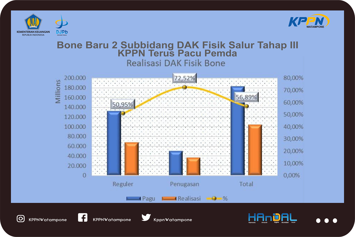 Secara agregat, sampai dengan saat ini total realisasi DAK Fisik Kabupaten Bone sebesar Rp103,77 miliar atau 56,89% dari total pagu sebesar Rp182,41 miliar. DAK Fisik Reguler terealisasi sebesar Rp67,37 miliar atau 50,95% dari pagu sebesar Rp132,21 miliar. DAK Fisik Penugasan teralisasi sebesar Rp36,41 miliar atau 72,52% dari pagu sebesar Rp50,20 miliar.