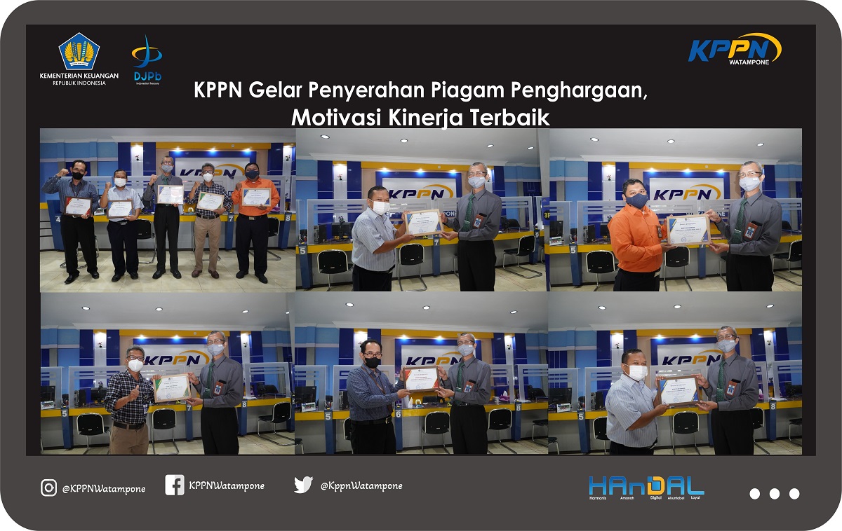 KPPN Watampone menggelar kegiatan penyerahan Piagam Penghargaan dari Kanwil DJPb Provinsi, bertempat di Ruang Pelayanan (FO) KPPN diikuti oleh Pejabat Pengawas dengan tetap mematuhi protokol kesehatan, Kamis (14/10/2021).