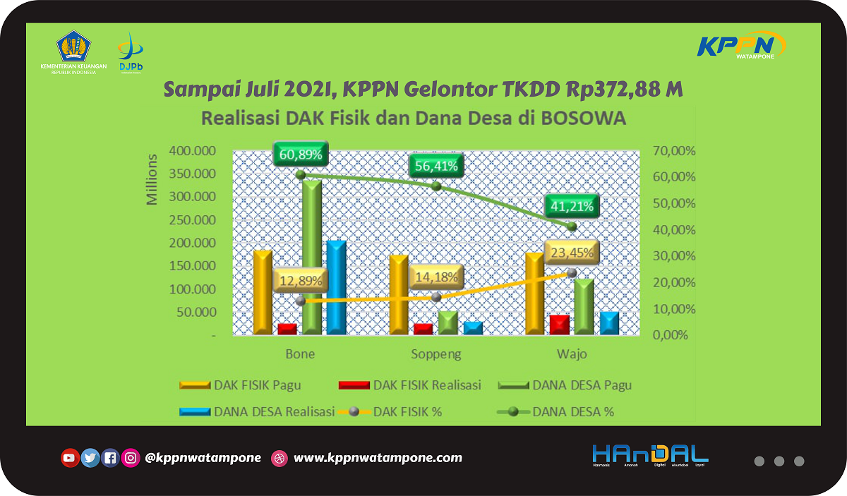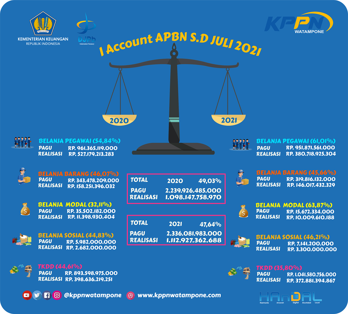 Berdasarkan data Online Monitoring Sistem Perbendaharaan dan Anggaran Negara (OMSPAN), realisasi belanja APBN di wilayah pembayaran KPPN Watampone yang meliputi Kabupaten Bone, Soppeng dan Wajo (Bosowa) sampai dengan bulan Juli 2021 sebesar Rp1,11 Triliun atau 47,64% dari total pagu sebesar Rp2,34 triliun. Apabila dibandingkan dengan periode yang sama tahun 2020 realisasi sebesar Rp1,10 Triliun atau 49,03% dari pagu sebesar Rp2,24 triliun, mengalami sedikit penurunan persentase sebesar 1,39%.
