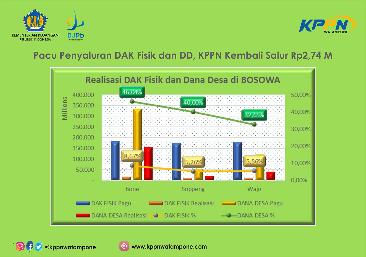 KPPN Watampone terus memacu Pemerintah Daerah di Bone, Soppeng dan Wajo (BOSOWA) untuk melakukan percepatan penyaluran DAK Fisik dan Dana Desa (DD) yang bersumber dari APBN, kembali menyalurkan DAK Fisik dan DD sebesar Rp2,74 miliar, Rabu (16/06/2021).