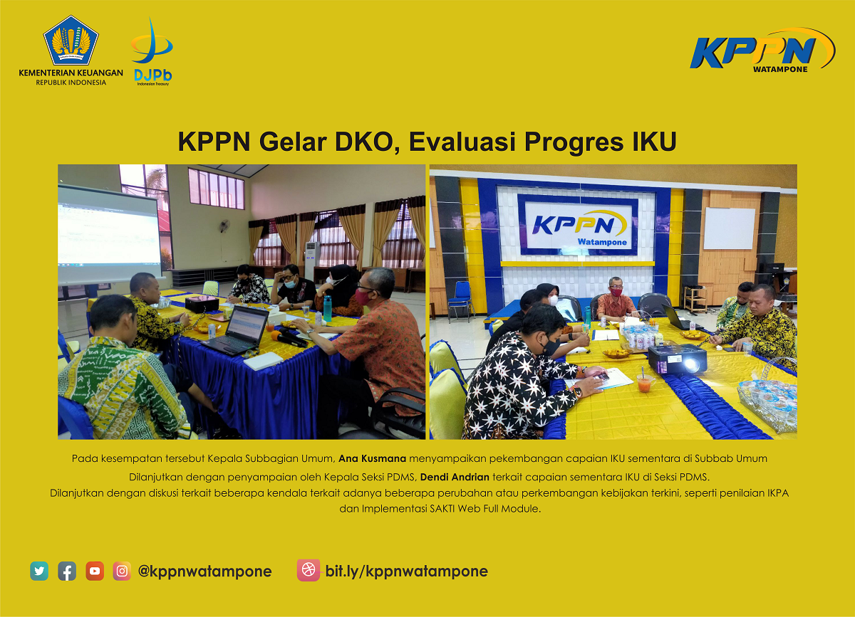 Kepala KPPN Watampone, RintokJuhirman dalam kesempatan tersebut memberikan arahan, pentingnya kegiatan DKO tersebut dilaksanakan dalam rangka terus berupaya untuk memberikan kinerja terbaik bagi individu maupun organisasi. Melalui evaluasi progress capaian sementara IKU triwulan I tahun 2021 dapat mengetahui kendala, hambatan maupun upaya yang perlu dilakukan untuk mengatasinya.
