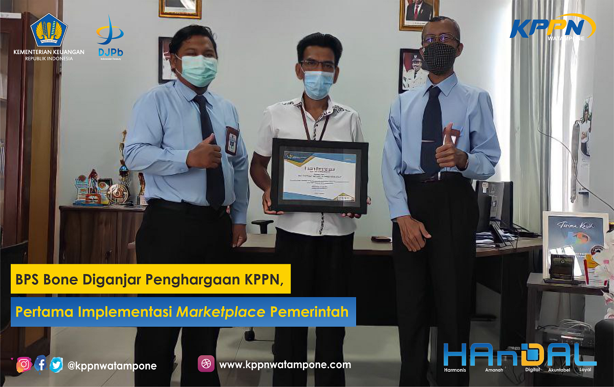 KPPN Watampone memberikan penghargaan kepada Badan Pusat Statistik (BPS) Kabupaten Bone, sebagai Satker Pertama dalam mengimplementasikan Digital Payment-Marketplace Pemerintah lingkup wilayah pembayaran KPPN Watampone, bertempat di Ruang Kepala BPS Bone dengan tetap mematuhi protokol kesehatan, Rabu (30/06/2020).
