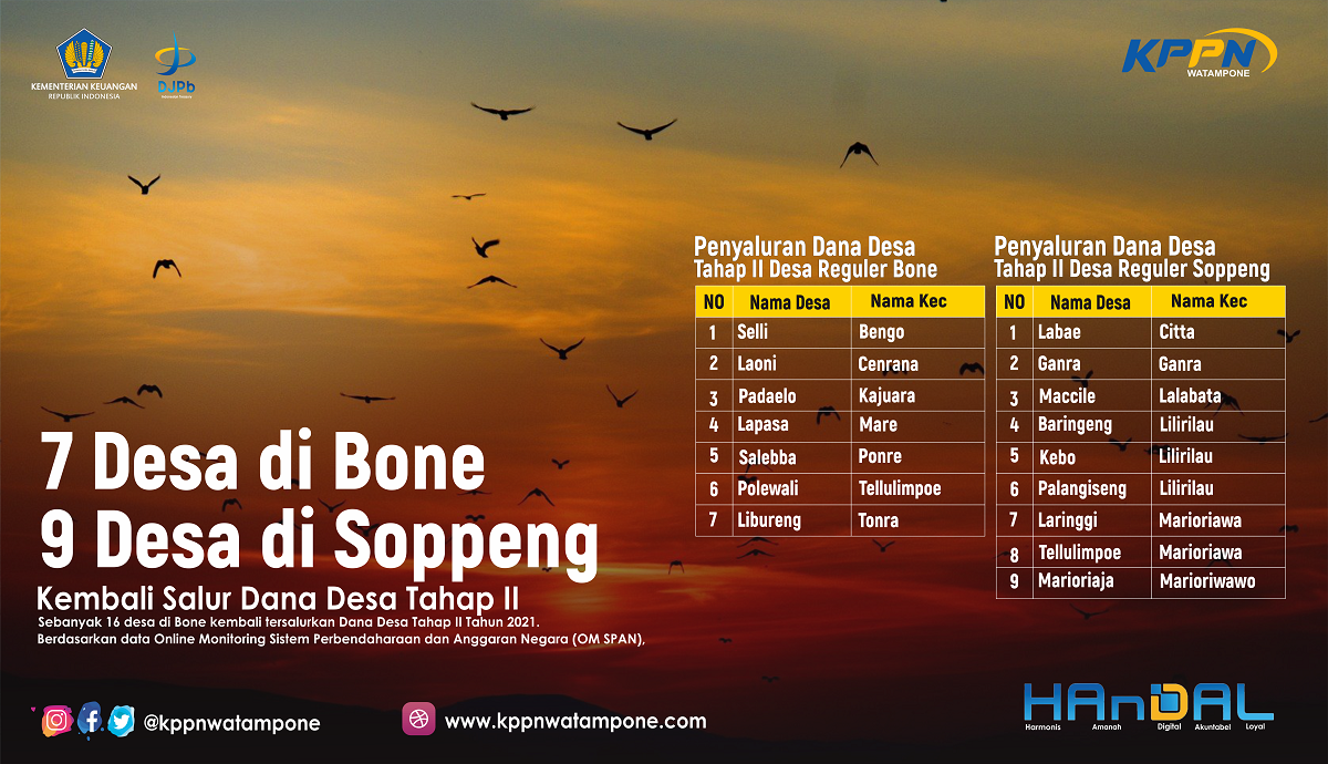 Sebanyak 16 desa di Bone dan Soppeng kembali tersalurkan Dana Desa Tahap II Tahun 2021. Berdasarkan data Online Monitoring Sistem Perbendaharaan dan Anggaran Negara (OM SPAN), telah tersalur DD ke Rekening Kas Desa (RKD) sebesar Rp4,71 miliar, Selasa (29/06/2021).