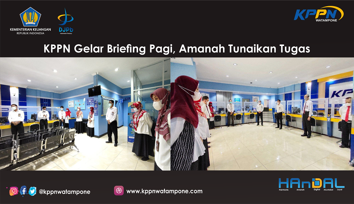 KPPN Watampone kembali menggelar kegiatan briefing bertempat di Ruang Pelayanan (FO) dengan tetap mematuhi protokol kesehatan, yang diikuti oleh seluruh pegawai dan PPNPN guna menyamakan persepsi untuk kinerja terbaik bagi individu dan organisasi, Senin (05/07/2021).