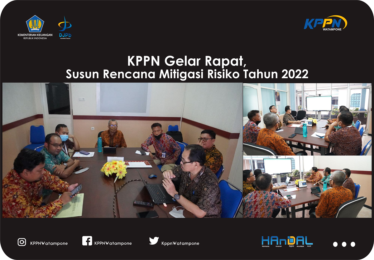 Dalam pembahasan rencana rencana mitigasi risiko tahun 2022 KPPN Watampone tersebut mengacu pada template yang telah dibuat oleh Kantor Pusat DJPb. Masing-masing Seksi/Subbagian menyampaikan rencana mitigasi risiko untuk selanjutkan akan diadakan rapat penentuan yang perlu dilakukan mitigasi risiko.