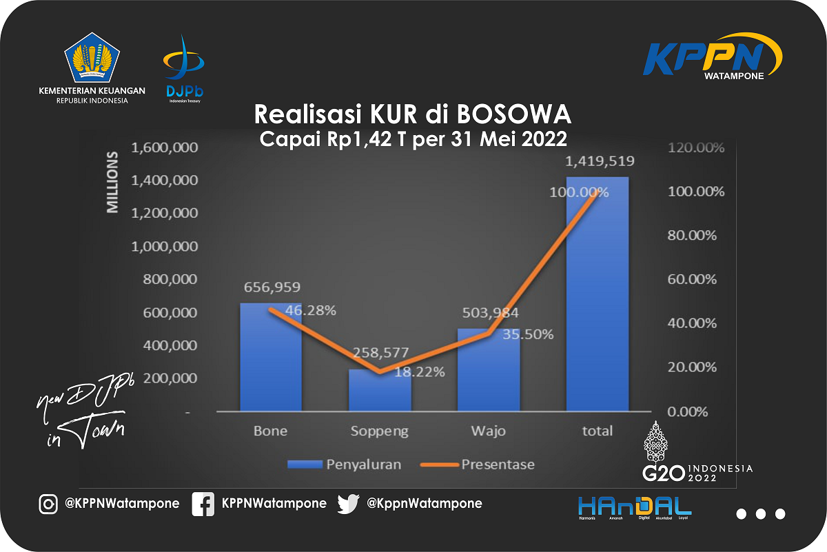 Pemerintah terus mendorong ralisasi penyaluran kredit usaha rakyat (KUR) di tengah pemulihan ekonomi nasional, Kepala KPPN Watampone Djoko Julianto mengungkapkan, bahwa sampai dengan 31 Mei 2022, realisasi KUR di wilayah BOSOWA telah mencapai Rp1,42 triliun atau 20,12% dari total realisasi KUR di Provinsi Sulawesi Selatan hal ini berdasarkan data pada Aplikasi Sistem Informasi Kredit Usaha Rakyat (SIKP).