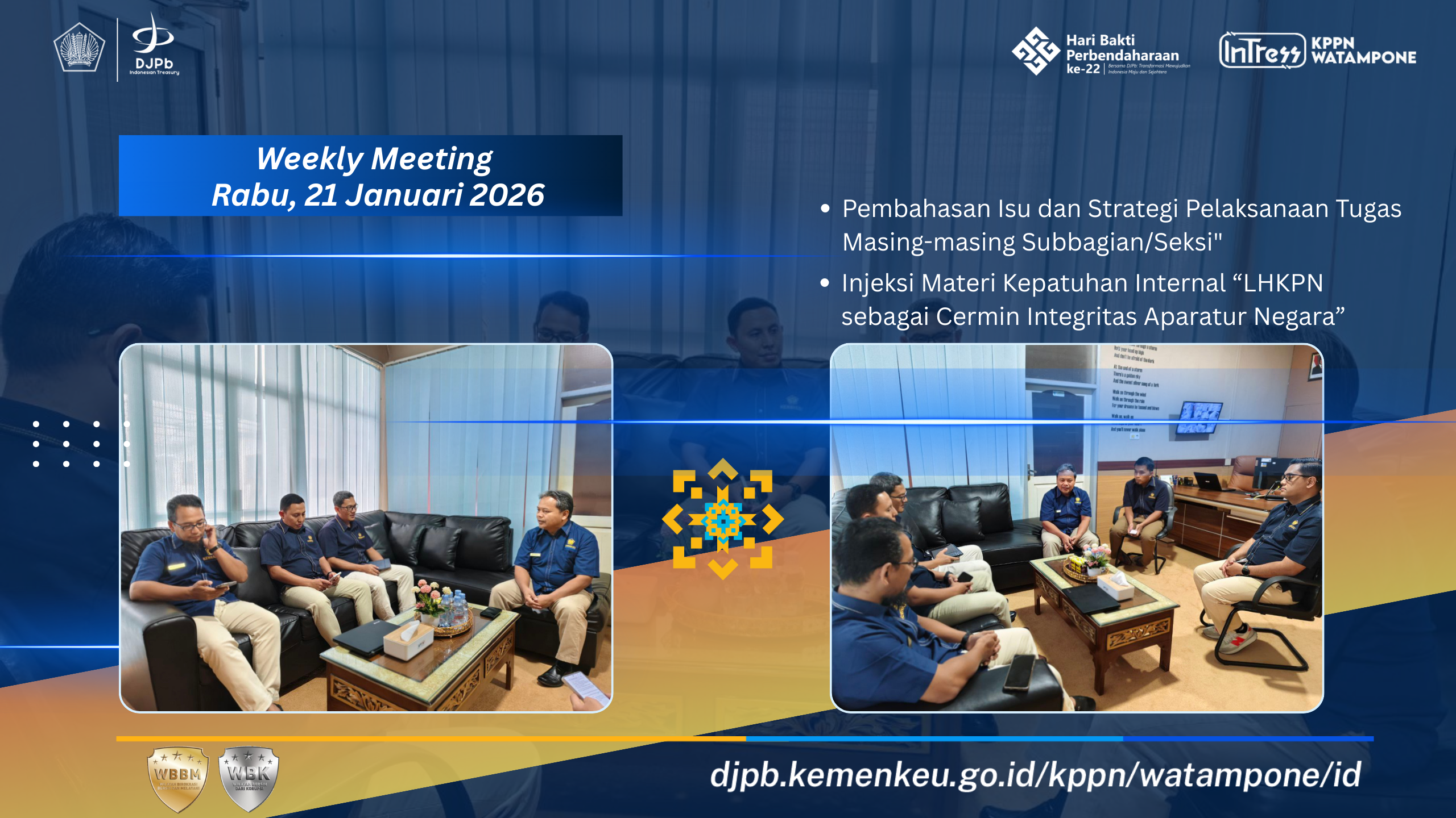 Dalam upaya meningkatkan koordinasi dan menguatkan integritas aparatur negara, Kantor Pelayanan Perbendaharaan Negara (KPPN) Watampone menyelenggarakan weekly meeting yang mengangkat tema “Pembahasan Isu dan Strategi Pelaksanaan Tugas dan Kegiatan Masing-Masing Subbagian/Seksi”, serta Injeksi Materi Kepatuhan internal tentang “LHKPN sebagai Cermin Integritas Aparatur Negara”. Acara yang berlangsung di ruang kepala KPPN Watampone pada hari Rabu (21/1/2025) tersebut dihadiri oleh pejabat pengawas dan pejabat fungsional KPPN Watampone.