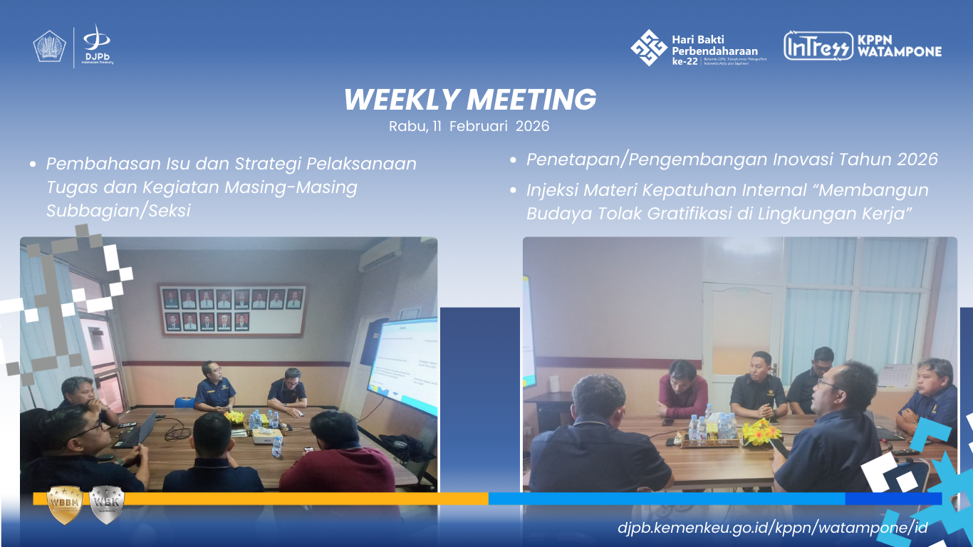 Kantor Pelayanan Perbendaharaan Negara (KPPN) Watampone menggelar weekly meeting pada Rabu (11/2/2026) untuk mematangkan strategi kinerja 2026 sekaligus memperkuat budaya tolak gratifikasi di lingkungan kerja. Pertemuan ini menjadi ruang konsolidasi arah kerja, evaluasi tantangan, serta penguatan komitmen integritas aparatur.