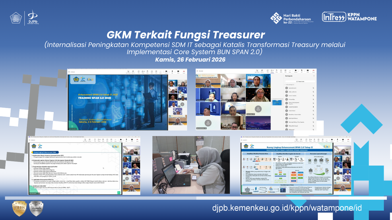 Kantor Pelayanan Perbendaharaan Negara Watampone (KPPN) menggelar sharing session Enhancement SPAN 2.0 Tahap II sebagai bagian dari penguatan implementasi fungsi treasurer pada Triwulan I Tahun 2026, Kamis (26/2/2026). Kegiatan yang dilaksanakan secara daring melalui Microsoft Teams itu diikuti seluruh pegawai.