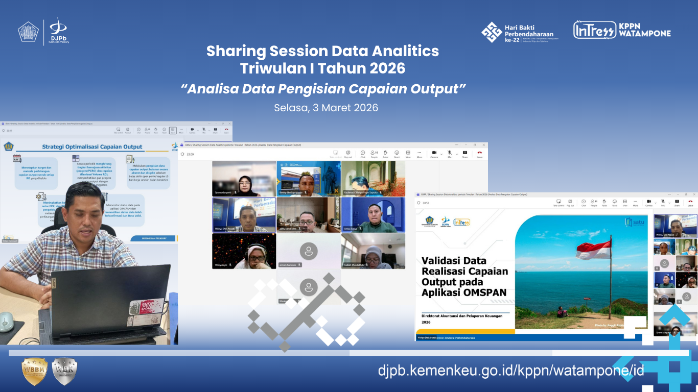 KPPN Watampone menggelar kegiatan Sharing Session Data Analytics bertema “Analisa Data Pengisian Capaian Output” secara daring melalui aplikasi Microsoft Teams, Selasa (3/3/2026). Kegiatan ini diikuti seluruh pegawai sebagai bagian dari upaya memperkuat kualitas dan validitas data kinerja pelaksanaan anggaran.