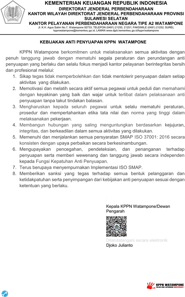 Melalui implementasi Standar Layanan ini, KPPN Watampone terus berkomitmen mendukung terwujudnya birokrasi yang profesional, berintegritas, dan berorientasi pada pelayanan prima, sejalan dengan agenda Reformasi Birokrasi Kementerian Keuangan dan Direktorat Jenderal Perbendaharaan.