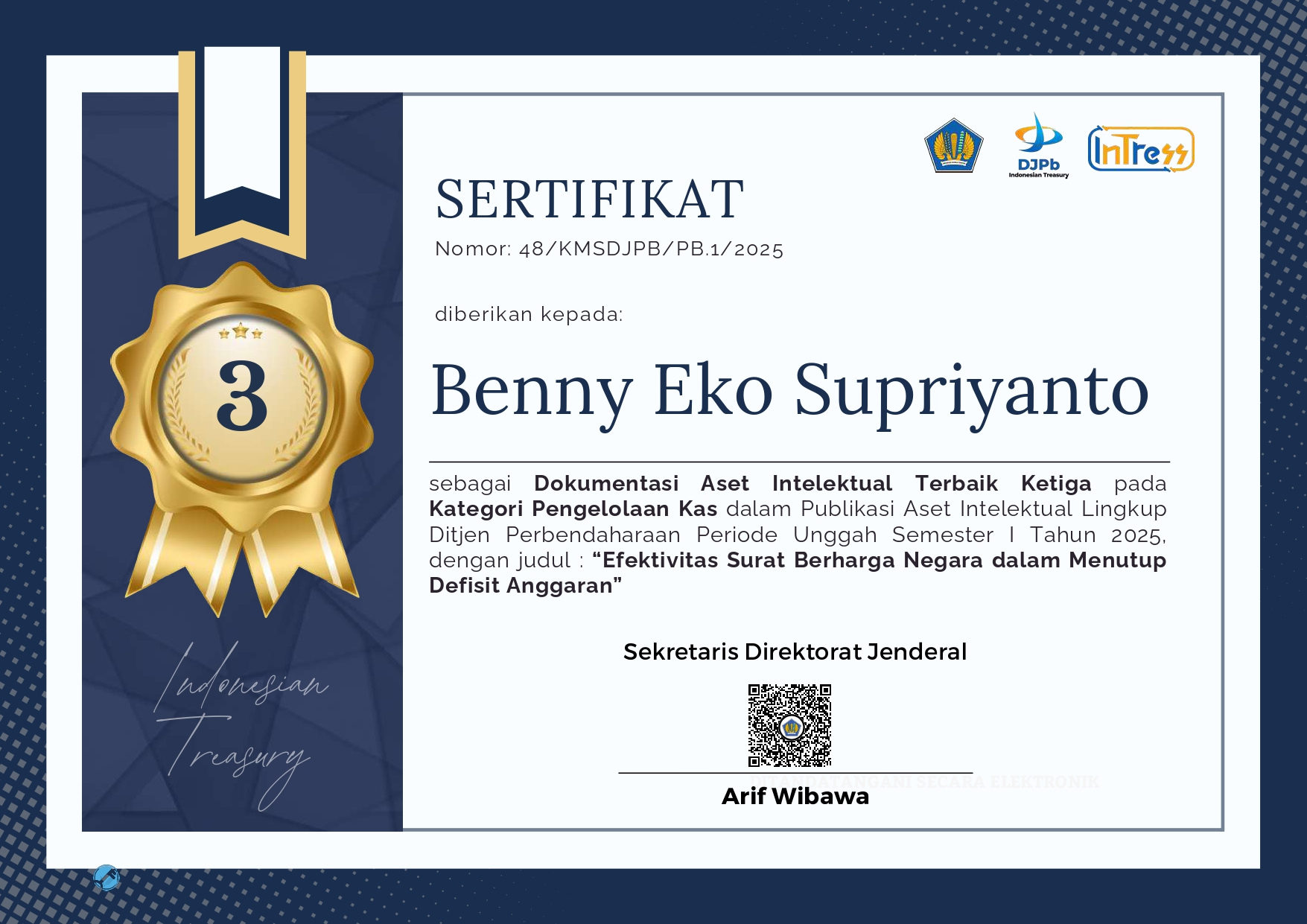 - Sebagai Dokumentasi Aset Intelektual Terbaik Ketiga pada Kategori Pengelolaan Kas dalam Publikasi Aset Intelektual Lingkup Ditjen Perbendaharaan Periode Unggah Semester I Tahun 2025, dengan judul : “Efektivitas Surat Berharga Negara dalam Menutup Defisit Anggaran”