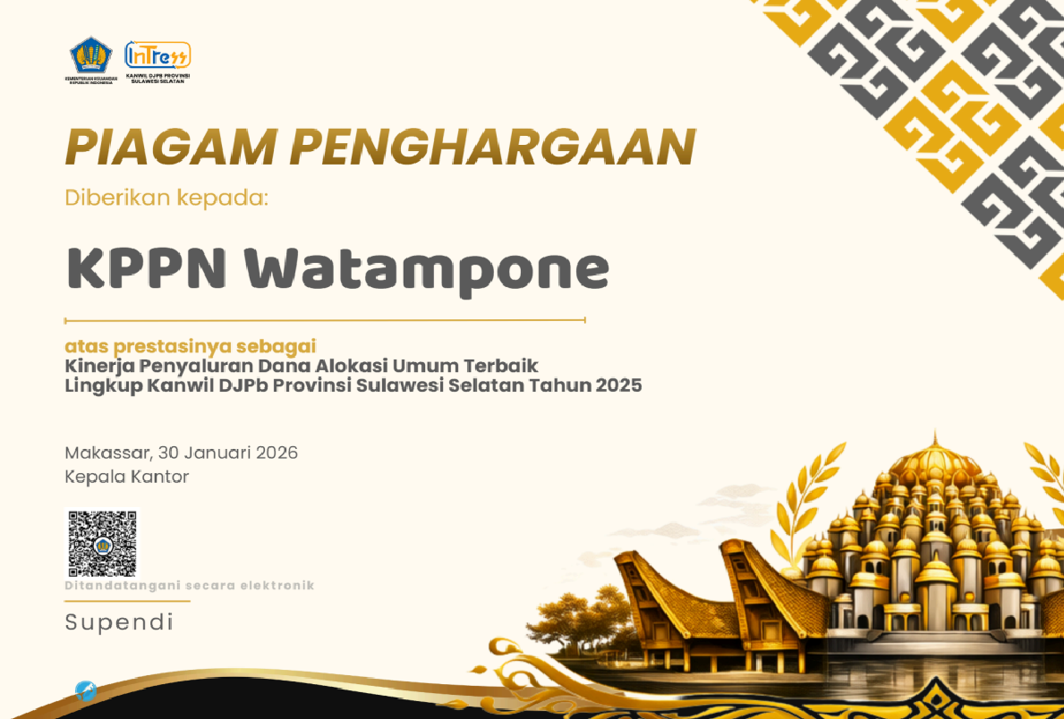 - Piagam Penghargaan atas prestasi sebagai Kinerja Penyaluran Dana Alokasi Umum Terbaik Lingkup Kanwil DJPb Provinsi Sulawesi Selatan Tahun 2025