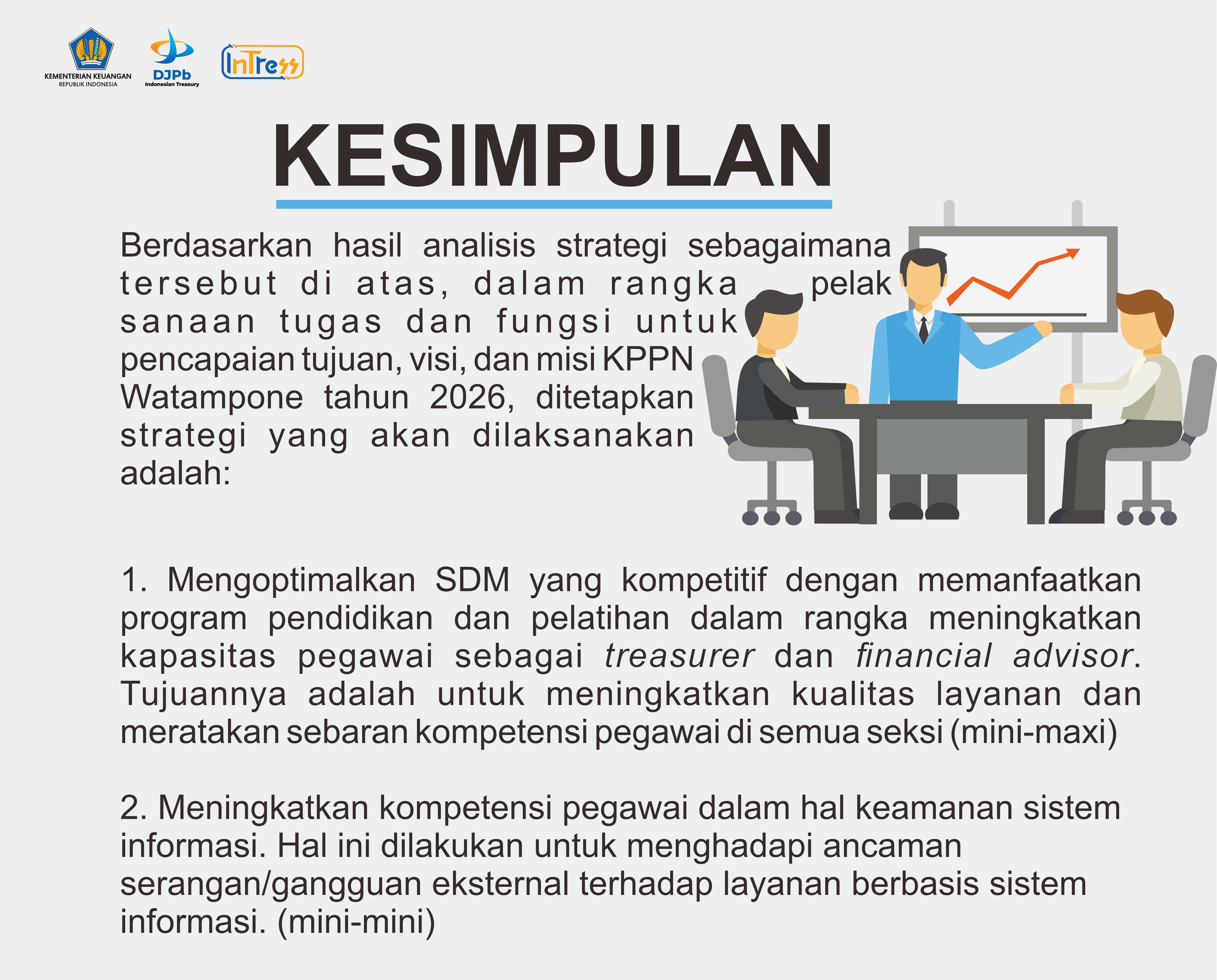 Strategi Organisasi merupakan pola atau rencana yang mengintegrasikan tujuan utama atau kebijakan organisasi dengan rangkaian tindakan dalam sebuah pernyataan yang saling mengikat yang berkaitan dengan prinsip-prinsip umum untuk mencapai misi organisasi (Wibisono, dalam Lynch, 2006). Sebuah organisasi yang baik akan merancang strategi dengan memperhatikan faktor internal berupa keunggulan dan kelemahan, serta faktor eksternal berupa peluang dan ancaman. Untuk itu, diperlukan suatu analisis memanfaatkan faktor-faktor tersebut dengan metode STEP, SWOT, dan TOWS sehingga dapat ditarik kesimpulan. Adapun untuk tahun 2026, analisis strategi KPPN Watampone adalah sebagai berikut: