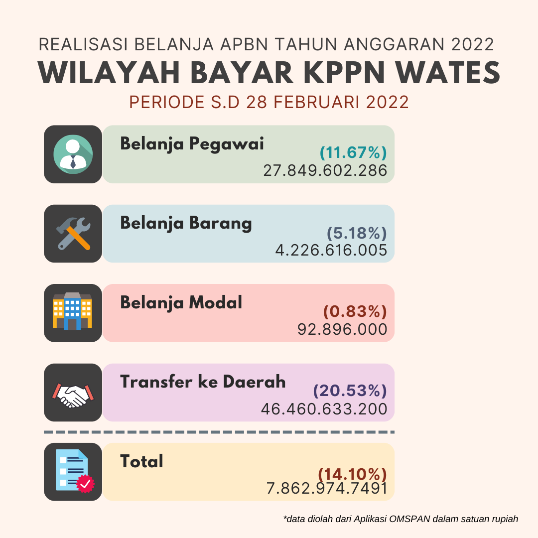 (kppn wates) - Realisasi APBN melalui satker mitra kerja KPPN Wates sampai dengan periode 28 Februari 2022 mencapai Rp78.629.747.491,- atau sebesar 14.10% dari total pagu T.A. 2022. Pagu dan realisasi per jenis belanja secara detail ditampilkan dalam gambar berikut: