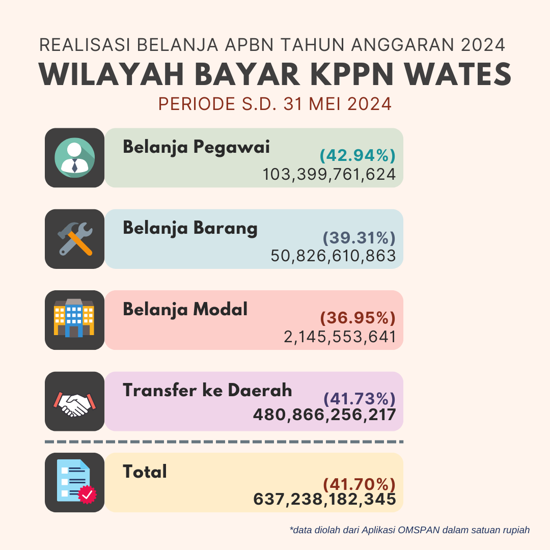 Realisasi APBN yang disalurkan melalui KPPN Wates sampai dengan bulan Mei 2024 telah mencapai Rp637,238,182,345 atau sebesar 41.70% dari total pagu yaitu sebesar Rp1,528,099,191,000.