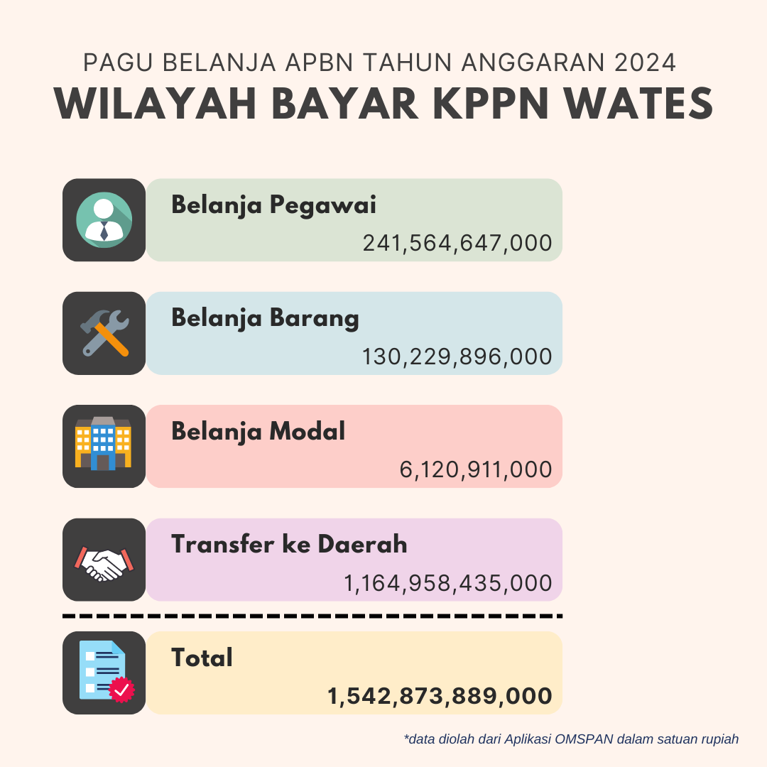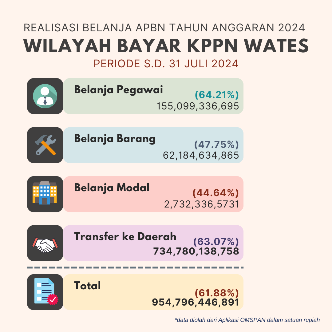 Realisasi APBN yang disalurkan melalui KPPN Wates sampai dengan bulan Juli 2024 telah mencapai Rp954,796,446,891 atau sebesar 61.88% dari total pagu yaitu sebesar Rp1,542,873,889,000.