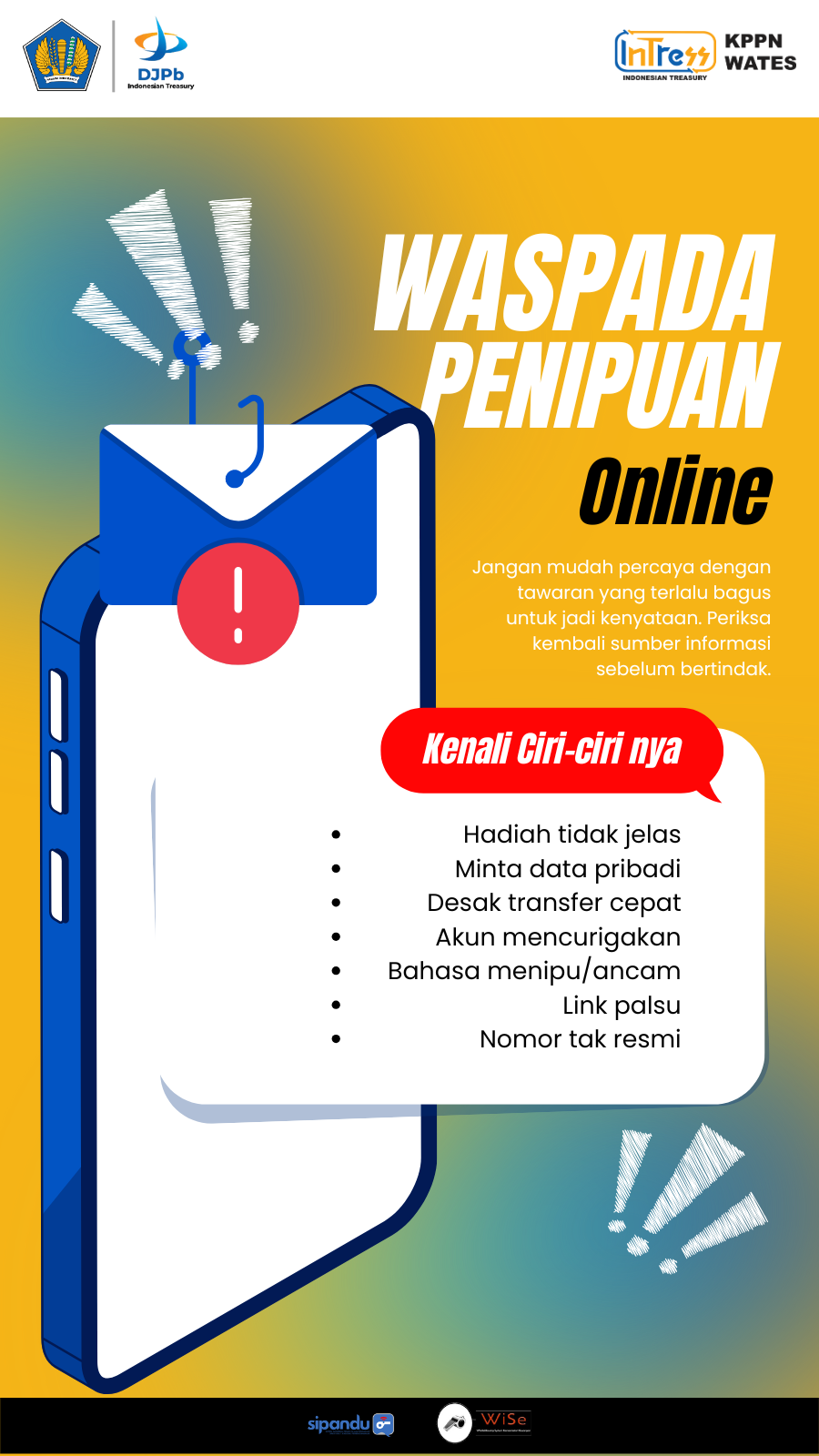 Lindungi dirimu dan orang-orang terdekat dari jebakan penipuan online. Jangan tergoda oleh hadiah yang tidak jelas, jangan berikan data pribadi, dan jangan transfer uang secara tergesa-gesa. Jika ada akun mencurigakan, bahasa ancaman, atau link palsu—langsung abaikan! Ingat, nomor resmi instansi bisa dicek, jadi jangan percaya begitu saja. Waspada adalah kunci utama keamanan digital. Yuk, jadi pengguna internet yang cerdas dan tangguh!