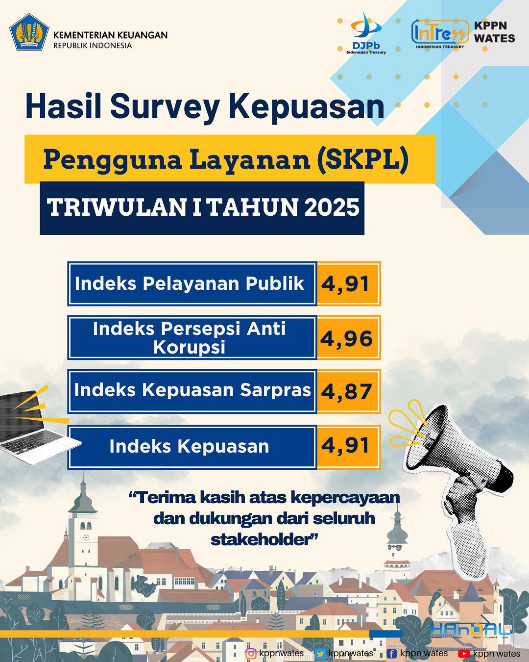 Seluruh pejabat beserta pegawai KPPN Wates mengucapkan terima kasih yang sebesar-besarnya kepada seluruh satker mitra kerja KPPN Wates atas penilaian dan partisipasi aktif dalam pelaksanaan kuesioner Kepuasan Pengguna Layanan Triwulan I tahun 2025.