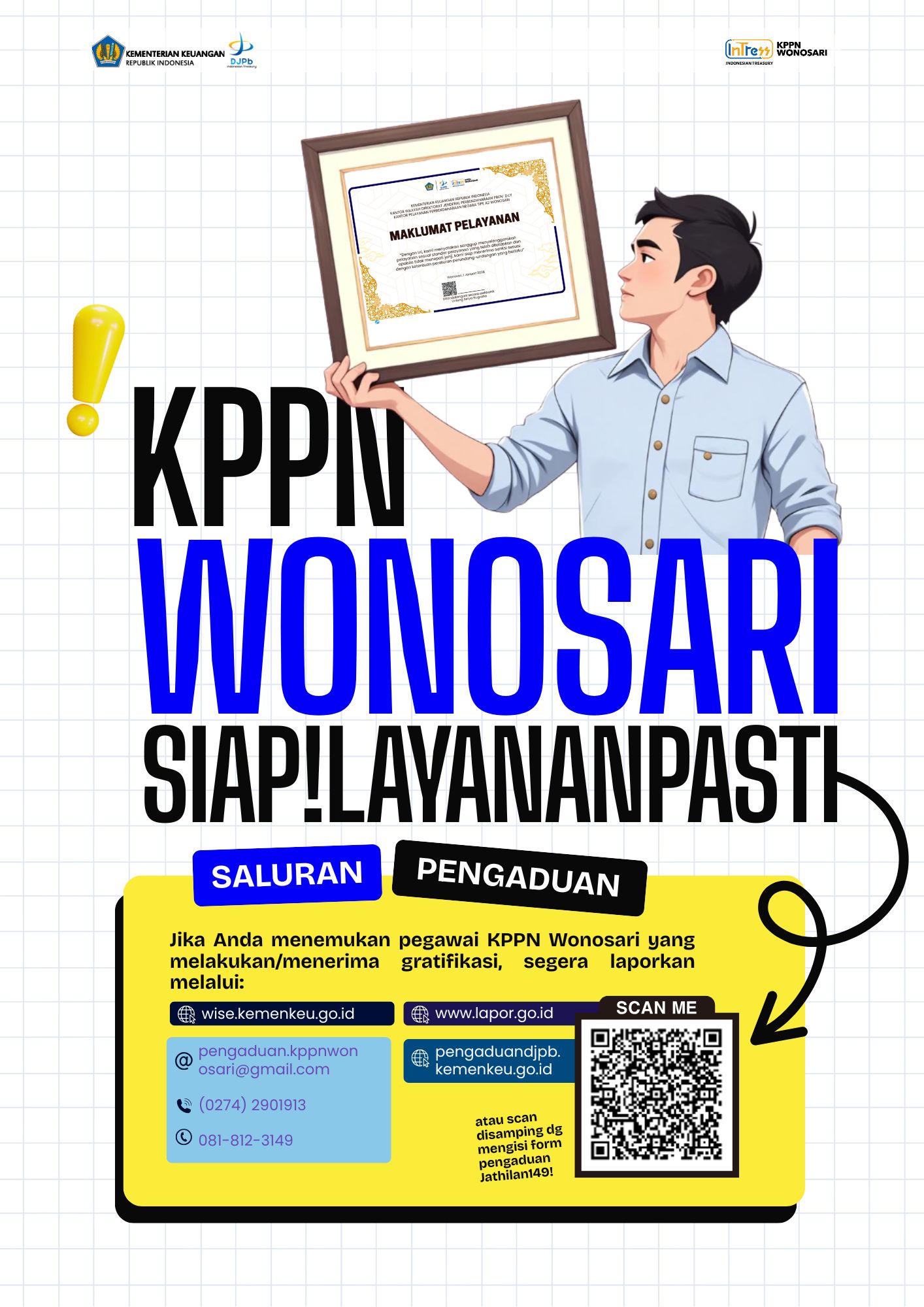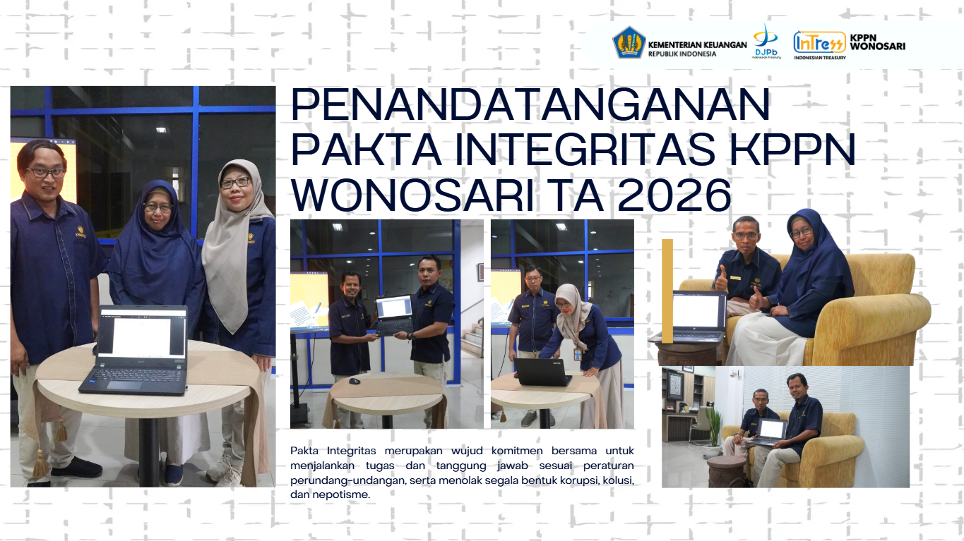 Dalam rangka mendukung pelaksanaan Reformasi Birokrasi dan Transformasi Kelembagaan di lingkungan Kementerian Keuangan, seluruh Pejabat dan Pegawai Kantor Pelayanan Perbendaharaan Negara (KPPN) Wonosari melaksanakan Penandatanganan Pakta Integritas. Kegiatan ini dilaksanakan secara elektronik melalui aplikasi Satu Kemenkeu dengan menggunakan Tanda Tangan Elektronik (TTE) Eksternal, sebagai bentuk adaptasi terhadap digitalisasi proses kerja dan penguatan tata kelola pemerintahan yang modern.