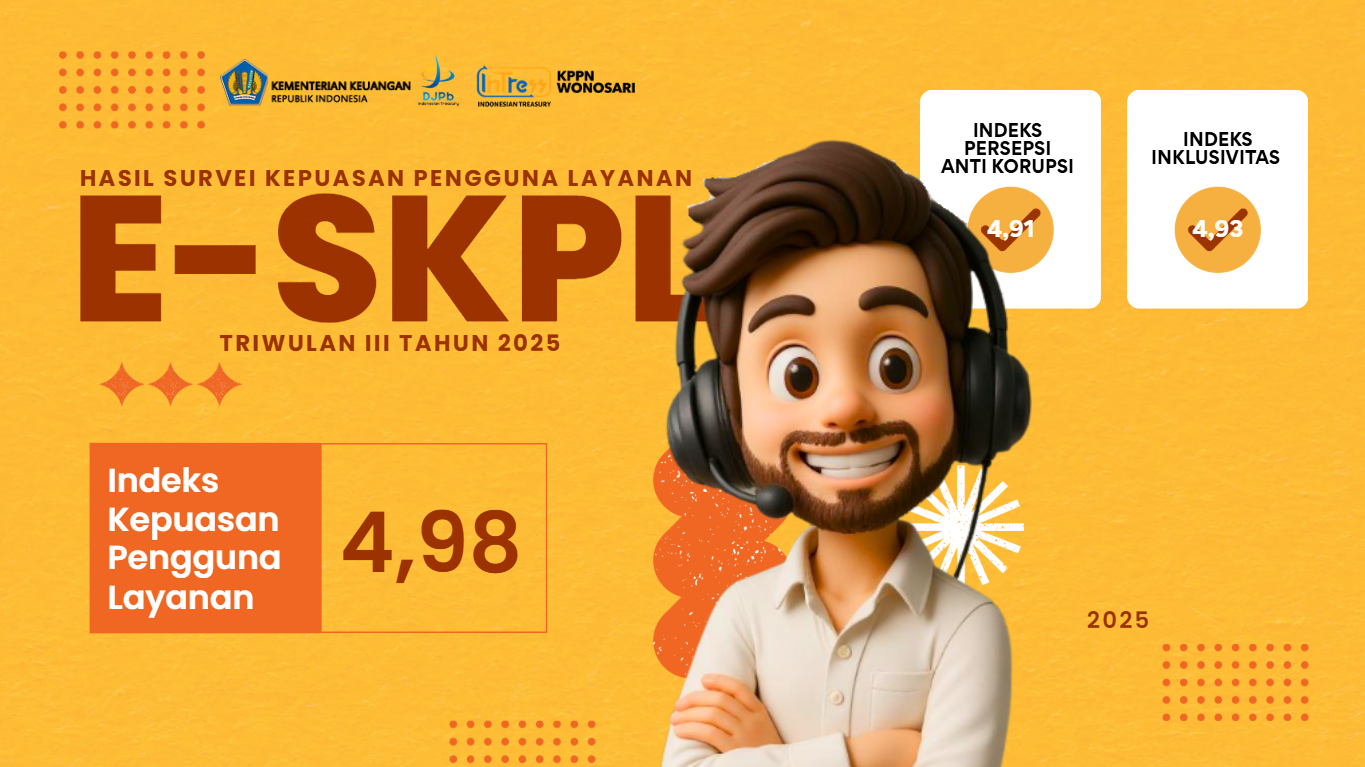Hasil Survei Kepuasan Pengguna Layanan Triwulan IV 2025 menunjukkan kategori sangat baik dengan rincian sebagai berikut Indeks Pelayanan Publik 4.98, Indeks Persepsi Anti Korupsi 4,91, dan Indeks Inklusifitas 4,93. Hasil SKM kumulatif Tahun 2025 menunjukkan peningkatan yang signifikan dibandingkan capaian Tahun 2024, yaitu dari 98,4 menjadi 99,6. Kenaikan sebesar 1,2 poin tersebut mencerminkan adanya perbaikan dan penguatan kualitas layanan yang dirasakan secara nyata oleh para pengguna layanan KPPN Wonosari. Apabila dibandingkan dengan capaian Tahun 2021 yang sebesar 97,2, maka capaian SKM Tahun 2025 menunjukkan peningkatan yang sangat signifikan, yaitu naik sebesar 2,4 poin. Hal ini menggambarkan bahwa upaya perbaikan layanan yang dilakukan secara berkelanjutan dalam beberapa tahun terakhir telah memberikan hasil yang positif dan konsisten. Tingginya capaian pada unsur-unsur tersebut mencerminkan kepuasan pengguna layanan terhadap kepastian layanan bebas biaya, kesesuaian hasil layanan, kompetensi petugas, serta efektivitas mekanisme penanganan pengaduan yang telah diterapkan. Kami menyampaikan terima kasih dan apresiasi yang tinggi atas kolaborasi serta partisipasi aktif Kuasa Pengguna Anggaran Satker mitra kerja KPPN Wonosari beserta tim dalam penyelenggaraan e-SKPL Tahun 2025.