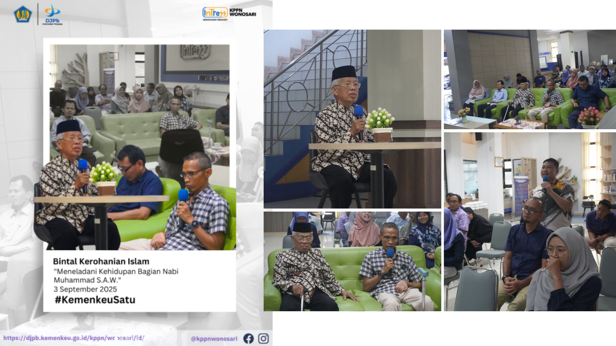 Wonosari, 3 September 2025 – Dalam rangka memperingati hari kelahiran Nabi Muhammad SAW, KPPN Wonosari melaksanakan kegiatan Bimbingan Mental (Bintal) Islam yang dilaksanakan di Ruang Front Office KPPN Wonosari, pada Rabu, 3 September 2025 pukul 15.30 WIB sampai dengan selesai. Kegiatan ini mengusung tema: “Meneladani Kehidupan Baginda Nabi Muhammad SAW” dengan narasumber Bapak Drs. Zamari, M.A. Turut hadir dalam kegiatan ini, selain seluruh pegawai KPPN Wonosari turut hadir pula para pegawai dari KPP Pratama Wonosari yang menunjukkan wujud nyata kolaborasi antarunit Kementerian Keuangan di daerah, khususnya dalam pembinaan rohani dan peningkatan integritas pegawai.