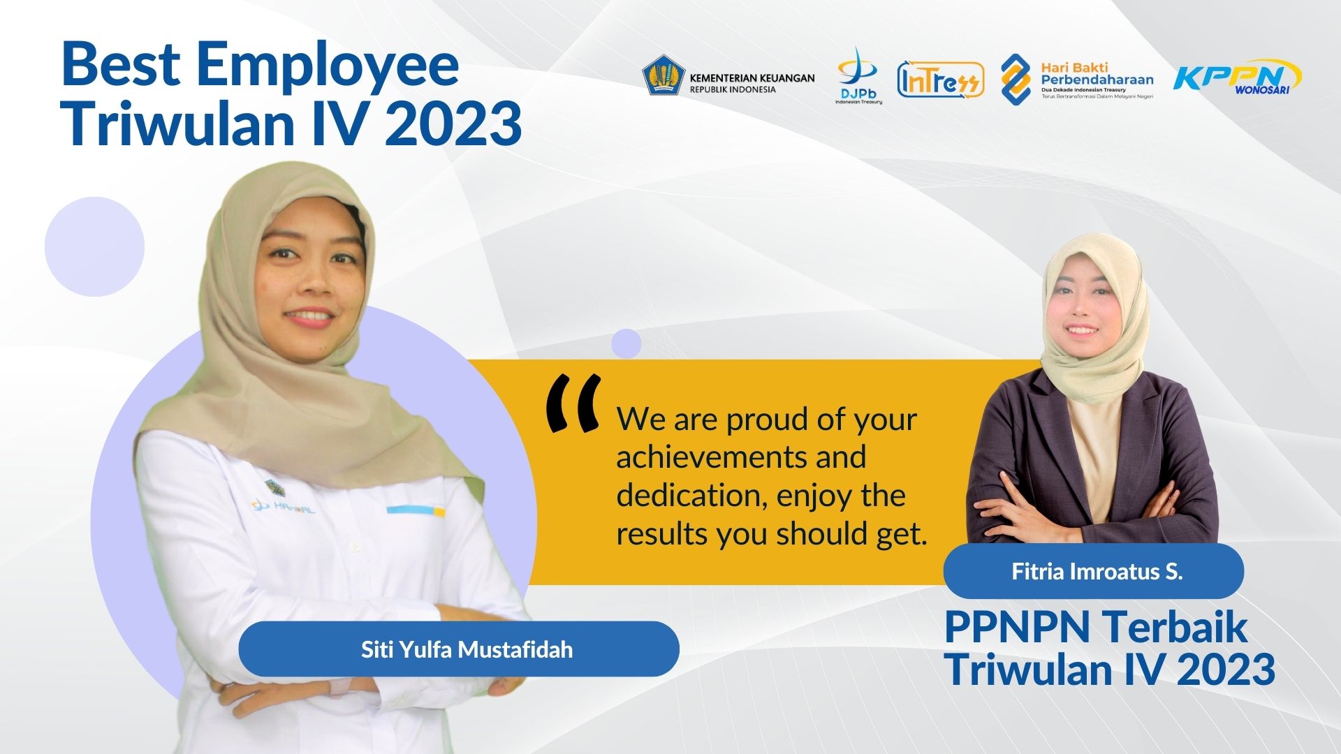 KPPN Wonosari sebagai salah satu instansi vertikal Ditjen Perbendaharaan selalu memberikan apresiasi atas capaian yang diraih oleh seluruh pegawainya baik ASN maupun PPNPN. Sebagai bentuk apresisasi atas kinerja terbaik yang telah didedikasikan, pada Triwulan IV Tahun 2023 Kepala KPPN Wonosari menetapkan Surat Keputusan Kepala Kantor Pelayanan Perbenaharaan Negara Tipe A2 Wonosari Nomor KEP-65/KPN.1502/2024 dan terpilih pegawai terbaik triwulan IV Tahun 2023 yaitu Siti Yulfa Mustafidah dan PPNPN terbaik triwulan IV Tahun 2023 yaitu Fitria Imroatus S. Dengan ditetapkannya best employee pada tahun 2023, semoga seluruh pegawai KPPN Wonosari dapat meneladani dan termotivasi untuk meningkatkan kinerjanya pada tahun 2024.