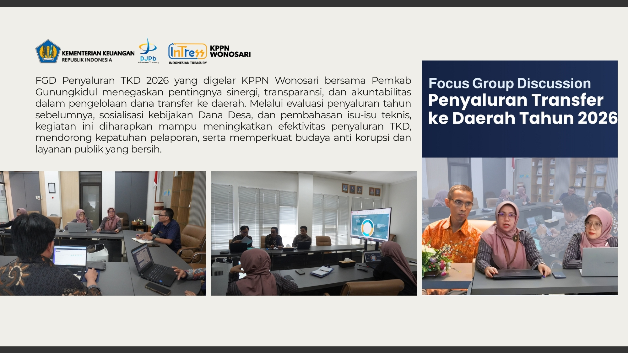 Pada Rabu, 12 Maret 2026, KPPN Wonosari menyelenggarakan kegiatan Focus Group Discussion (FGD) Penyaluran Transfer ke Daerah (TKD) Tahun 2026 yang dilaksanakan secara luring di ruang rapat KPPN Wonosari. Kegiatan ini bertujuan untuk melakukan evaluasi penyaluran TKD Kabupaten Gunungkidul tahun 2025 sekaligus mempersiapkan pelaksanaan penyaluran di tahun 2026.