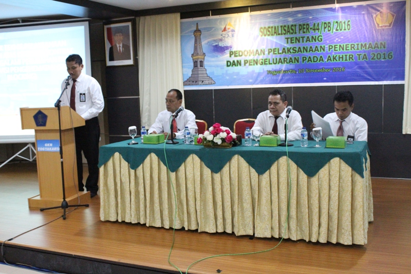 Acara Sosialisasi PER-44/PB/2016 tentang Pedoman Pelaksanaan Penerimaan dan Pengeluaran Negara pada Akhir Tahun Anggaran 2016 yang dihelat pada Kamis 10 November 2016 bertempat di Ruang Keraton Gedung Keuangan Negara Yogyakarta tersebut dibuka secara resmi oleh Kepala Kanwil Ditjen Perbendaharaan Provinsi D.I. Yogyakarta dengan dihadiri oleh Pejabat Pembuat Komitmen (PPK) dan Bendahara Pengeluaran pada seluruh Satuan Kerja mitra KPPN Yogyakarta yang berjumlah 339 satuan kerja.