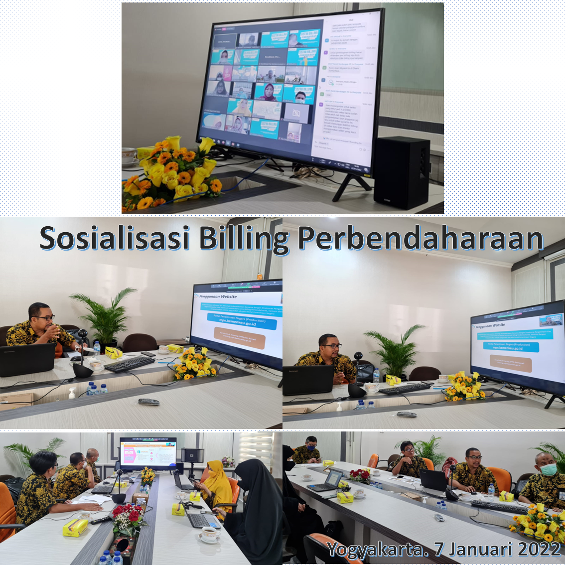 Sebagai bentuk tindak lanjut atas penunjukan Ditjen Perbendaharaan sebagai biller penerimaan negara lainnya sesuai PMK 225/PMK.05/2020, KPPN Yogyakarta mengadakan Sosialisasi Sistem Billing Perbendaharaan kepada seluruh Bendahara Pengeluaran / Penerimaan pada satker dan Pemda (se-Provinsi DI Yogyakarta, Kota Yogyakarta, Kabupaten Sleman, dan kabupaten Bantul) yang merupakan wilayah pembayaran KPPN Yogyakarta. Sosialisasi tersebut diadakan pada hari Jum'at, 07 Januari 2022 mulai pukul 08.00 WIB s.d. 11.30 WIB secara virtual melalui aplikasi zoom.