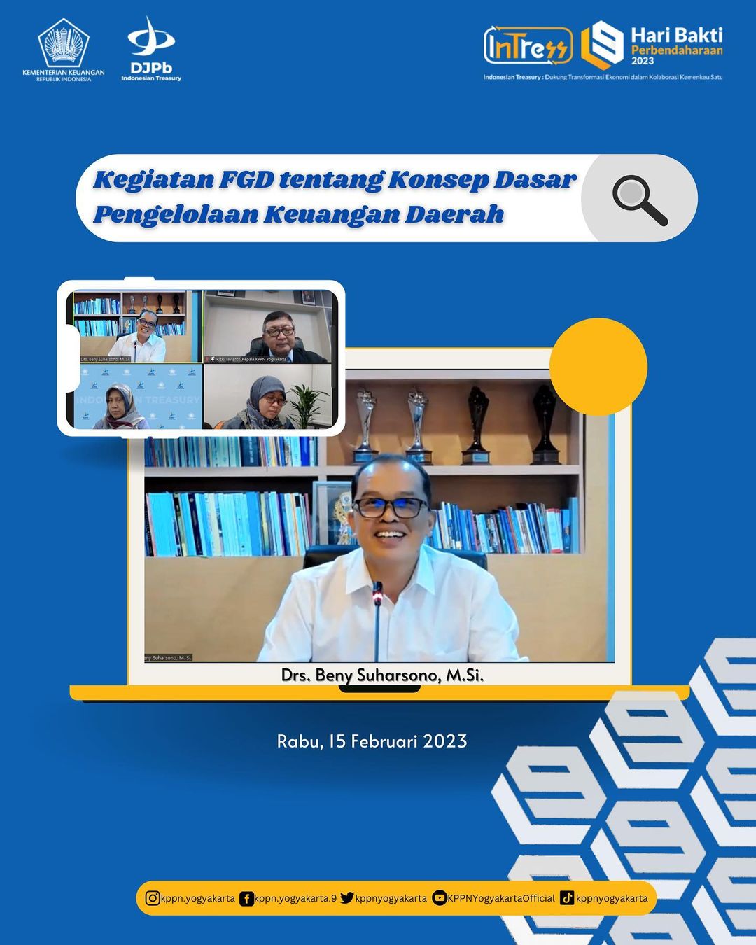 Rabu, 15 Februari 2023. KPPN Yogyakarta menyelenggarakan FGD terkait Konsep Dasar Pengelolaan Keuangan Daerah dengan Narasumber Kepala Badan Perencanaan Pembangunan Provinsi Daerah Istimewa Yogyakarta (Drs. Beny Suharsono, M.Si.) Selain diikuti oleh pegawai KPPN Yogyakarta, kegiatan FGD juga dihadiri Kanwil Ditjen Perbendaharaan Provinsi D. I. Yogyakarta dan KPPN Wates.
