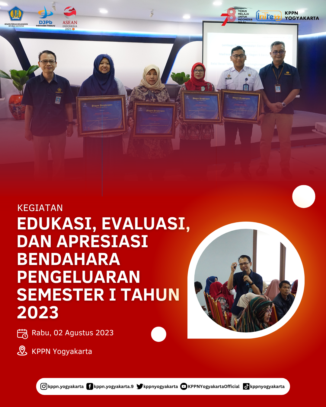 Sebagai tindak lanjut Inisiatif Strategis (IS) KPPN Yogyakarta Tahun 2023 berupa pemeringkatan bendahara sekaligus melaksanakan salah satu tugas fungsi Seksi Verifikasi dan Akuntansi berupa pembinaan kepada bendahara terkait peningkatan kualitas Laporan Pertanggungjawaban Bendahara Pengeluaran, KPPN Yogyakarta pada Rabu (2/8) menyelenggarakan kegiatan Edukasi, Evaluasi, dan Apresiasi Bendahara Pengeluaran Semester I Tahun 2023.