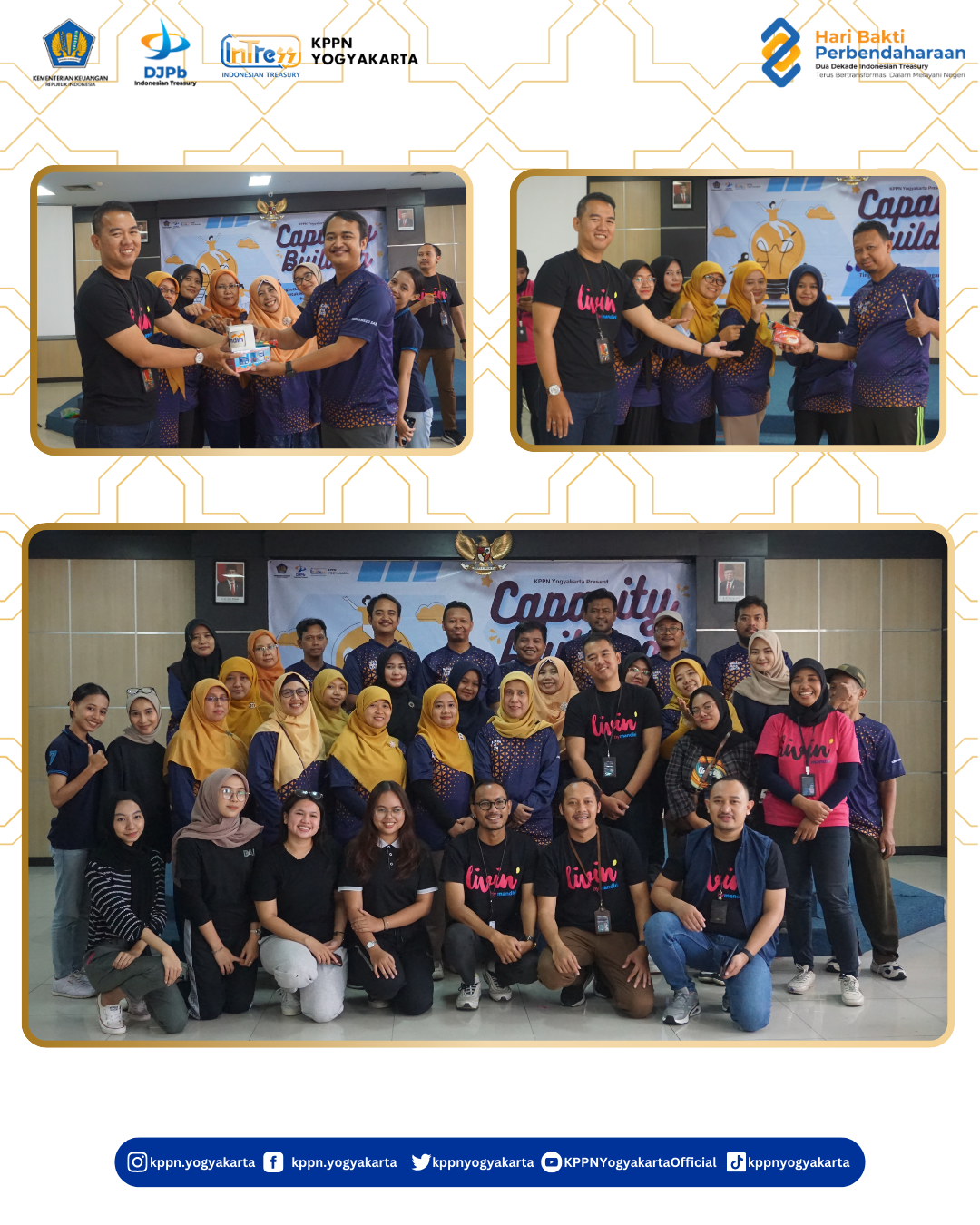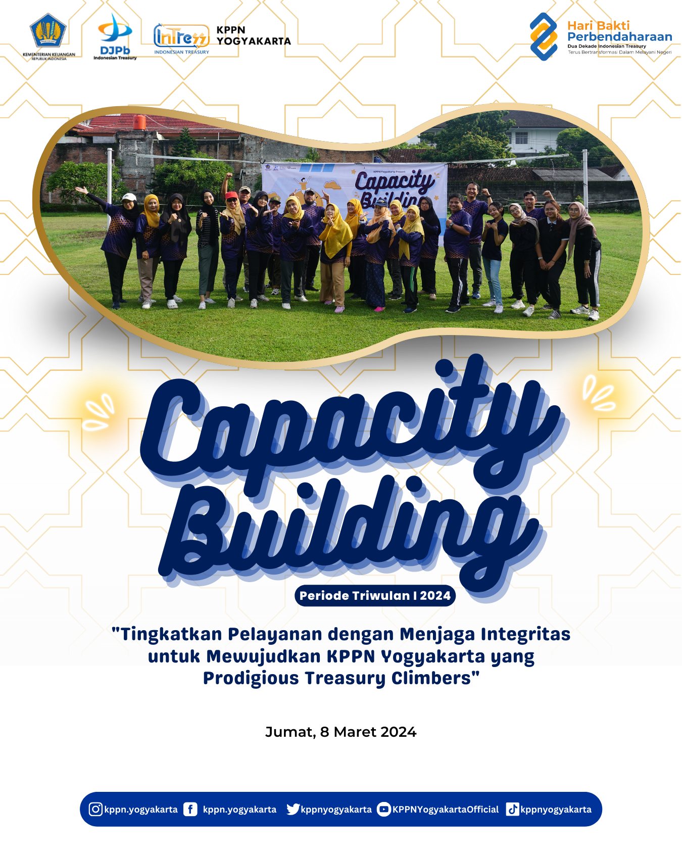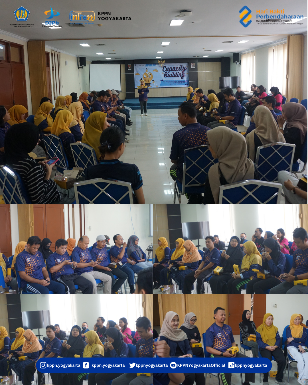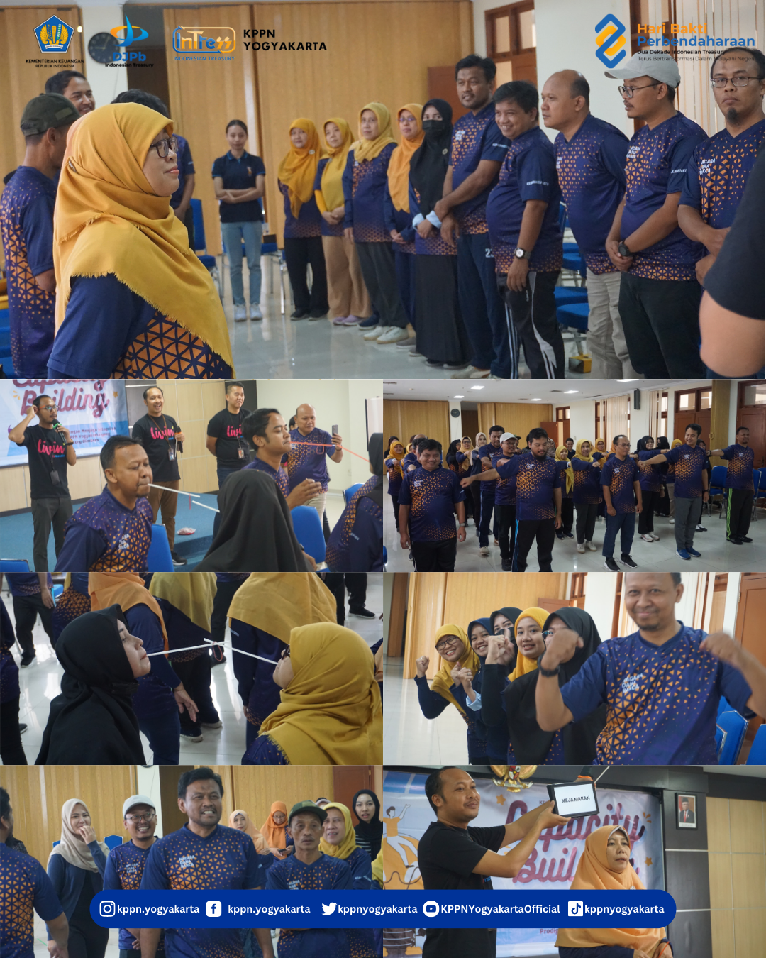 | Dalam rangka penguatan implementasi Budaya Kementerian Keuangan KPPN Yogyakarta bekerjasama dengan Bank Mandiri Cabang Katamso melaksanakan kegiatan Capacity Building dan Pembinaan Mental lingkup KPPN Yogyakarta Periode I 2024 pada Jumat, 8 Maret 2024 di Lapangan Volly GKN Yogyakarta dan Aula KPPN Yogyakarta. | |