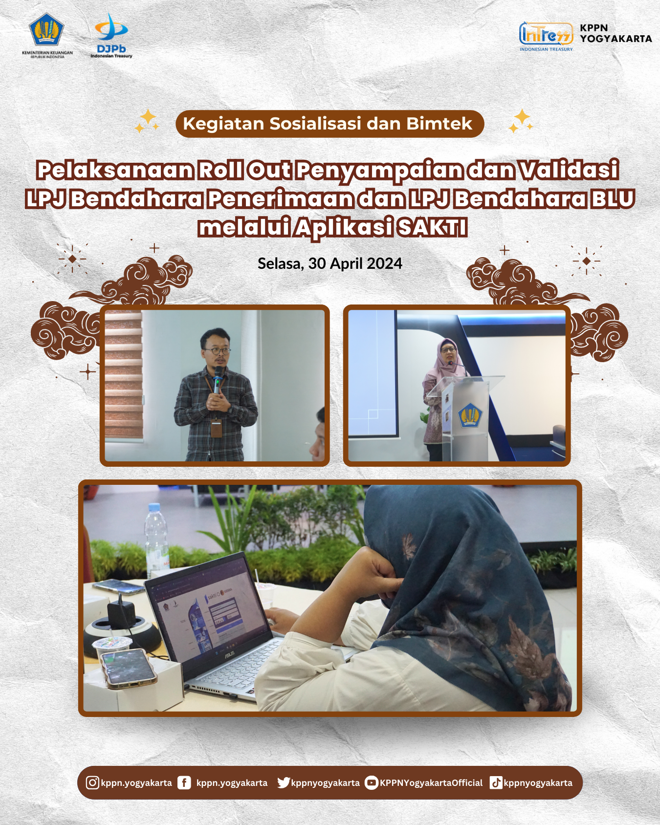 Pada Selasa (30/4) KPPN Yogyakarta menyelenggarakan Kegiatan Sosialisasi dan Bimtek Pelaksanaan Roll Out Penyampaian dan Validasi LPJ Bendahara Penerimaan dan LPJ Bendahara BLU melalui Aplikasi SAKTI, yang dilaksanakan di Ruang Aula Prambanan Lantai III GKN Yogyakarta.