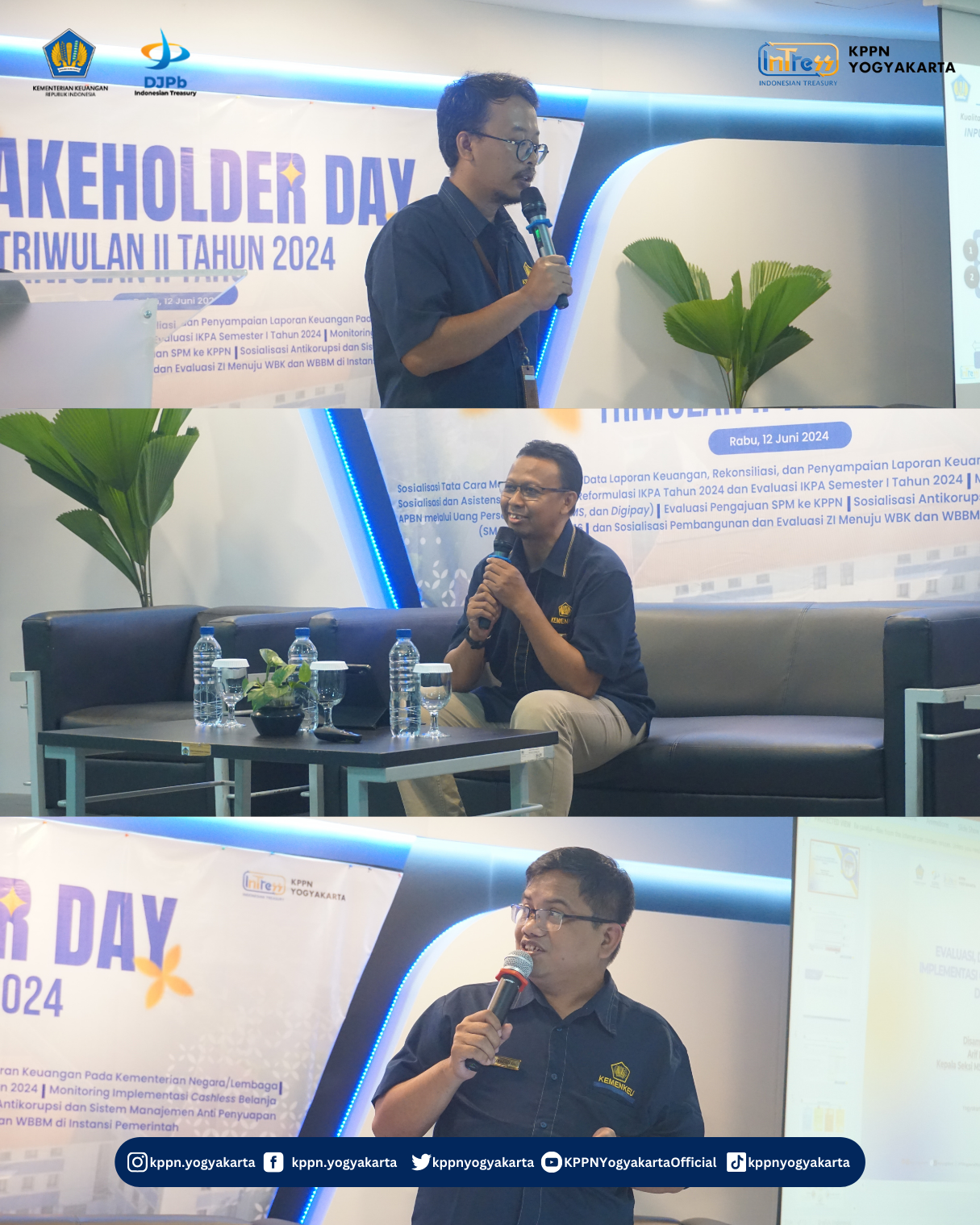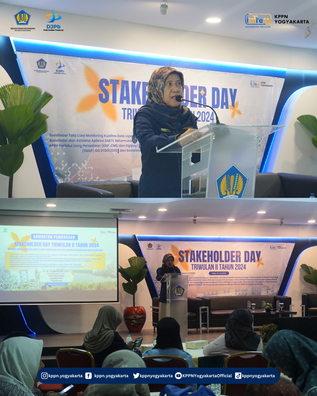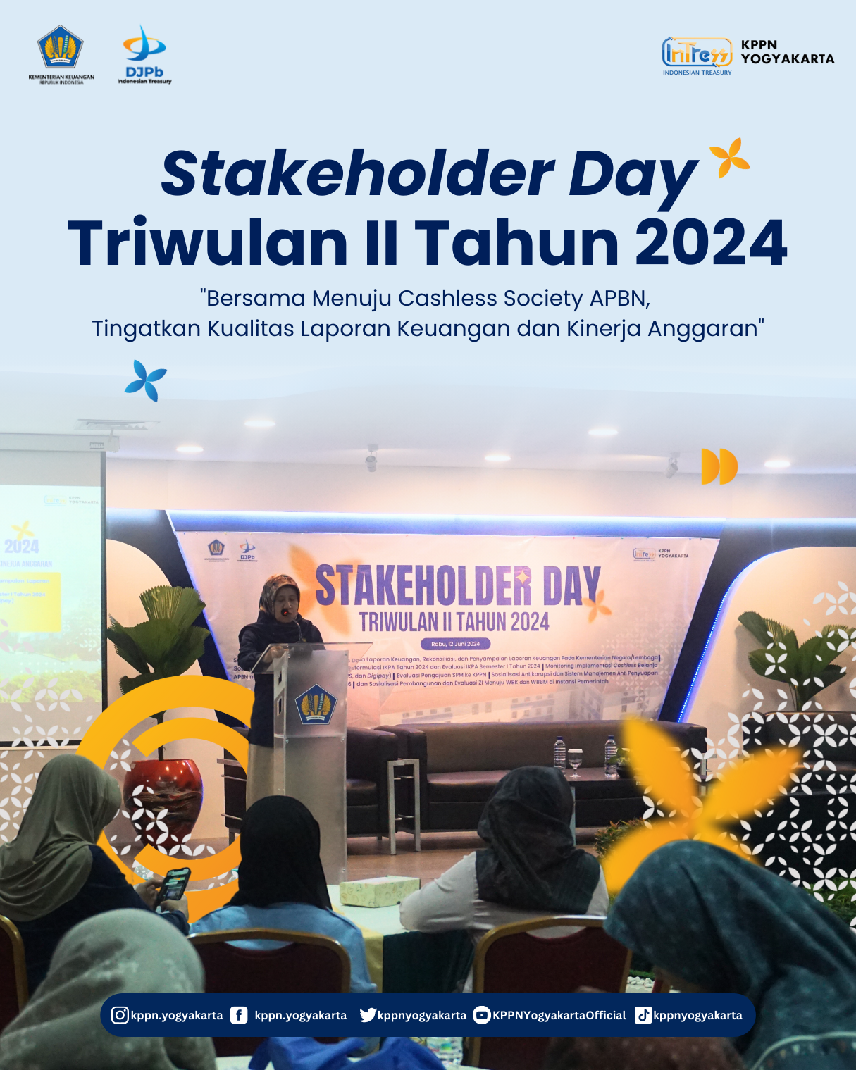 | Rabu (12/6) telah dilaksanakan kegiatan Stakeholder's Day KPPN Yogyakarta periode Triwulan II Tahun 2024 mengusung Tema "Bersama Cashless Society APBN, tingkatkan Kualitas Laporan Keuangan dan Kinerja Anggara". | |