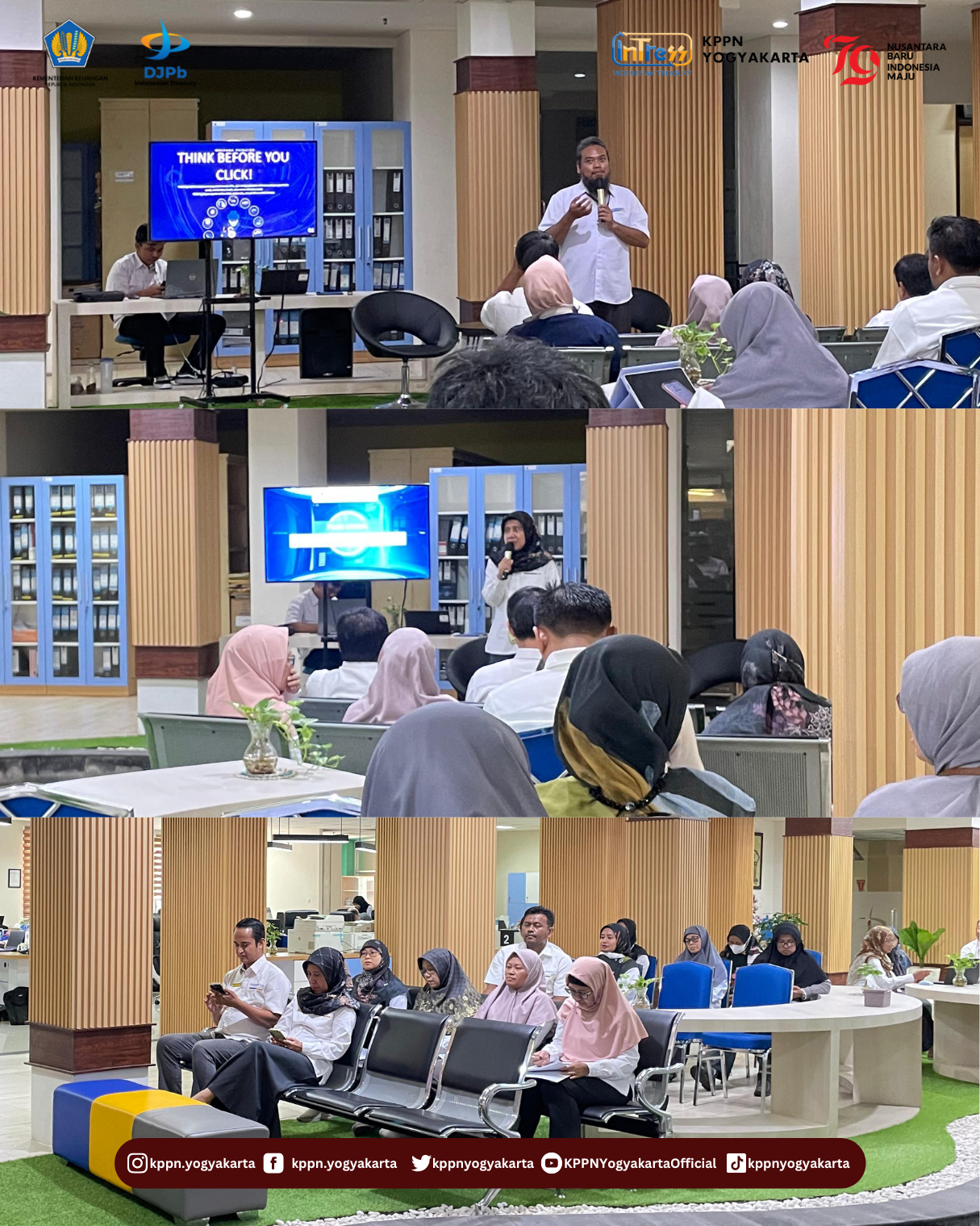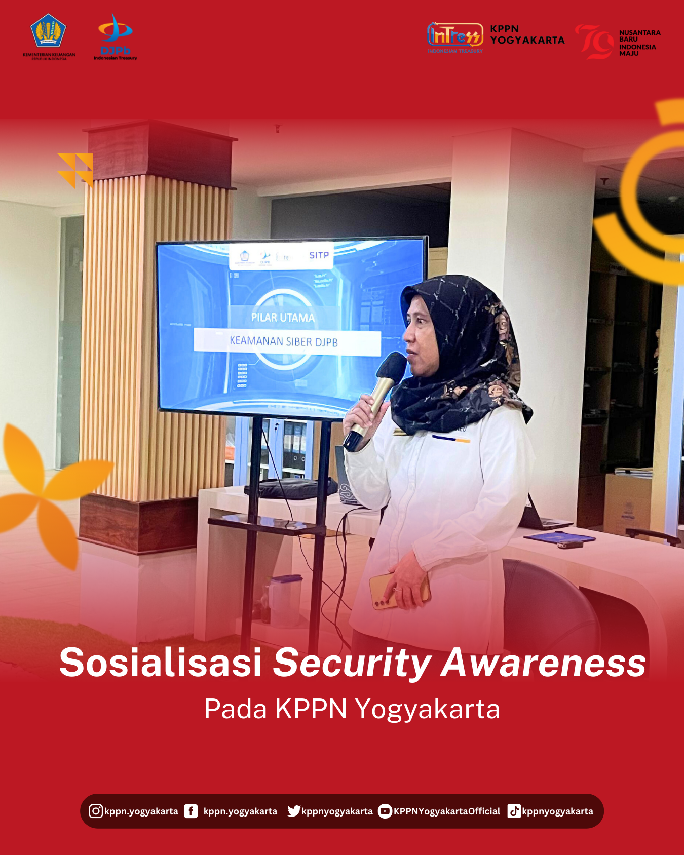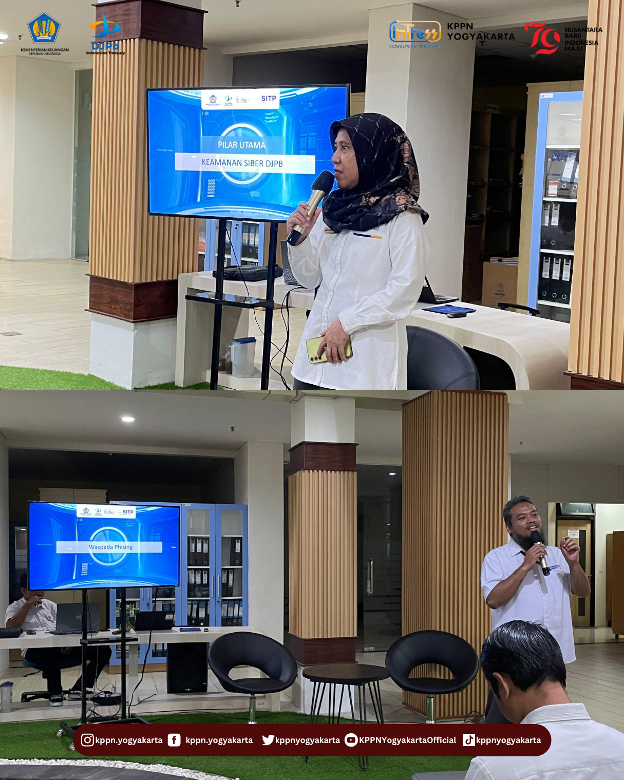 | KPPN Yogyakarta (26/9) menyelenggarakan kegiatan Sosialisasi Security Awarenss secara luring yang diikuti oleh seluruh pejabat/pegawai dengan narasumber Kepala KPPN Yogyakarta, Arvi Risnawati dan Moh Ali Imron. Dalam paparannya, disampaikan mengenai bahaya phising, cara mengidentifikasi serangan digital terutama pada email dan bagaimana cara memitigasi serangan phising tersebut. | |