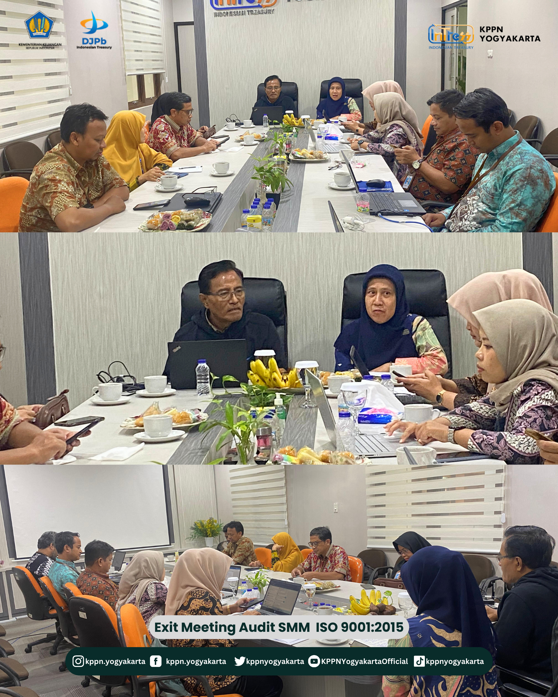 | KPPN Yogyakarta menyelenggarakan Audit SMM ISO 9001:2015 yang dimulai dengan Entry meeting (13/9) dan diakhiri dengan Exit Meeting (14/9) dengan peserta Kepala KPPN Yogyakarta, pejabat fungsional, pejabat pengawas serta perwakilan pegawai KPPN Yogyakarta. | |