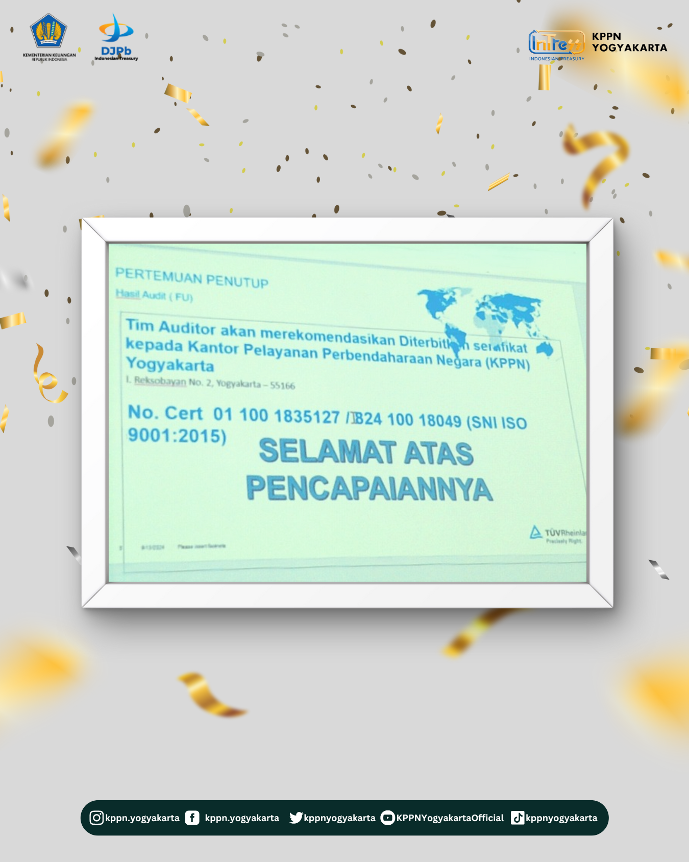 | Dalam kesempatan tersebut Heru Subroto sebagai memberikan kesimpulan dan rekomendasi dari hasil audit yaitu KPPN Yogyakarta telah memenuhi syarat dalam menerapkan manajemen mutu ISO 9001:2015. Tim audit memberikan rekomendasi untuk mempertahankan sertifikat ISO 9001:2015 kepada KPPN Yogyakarta. Serta memberikan selamat kepada KPPN Yogyakarta atas diraihnya Sertifikat ISO 9001:2015. | |